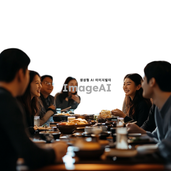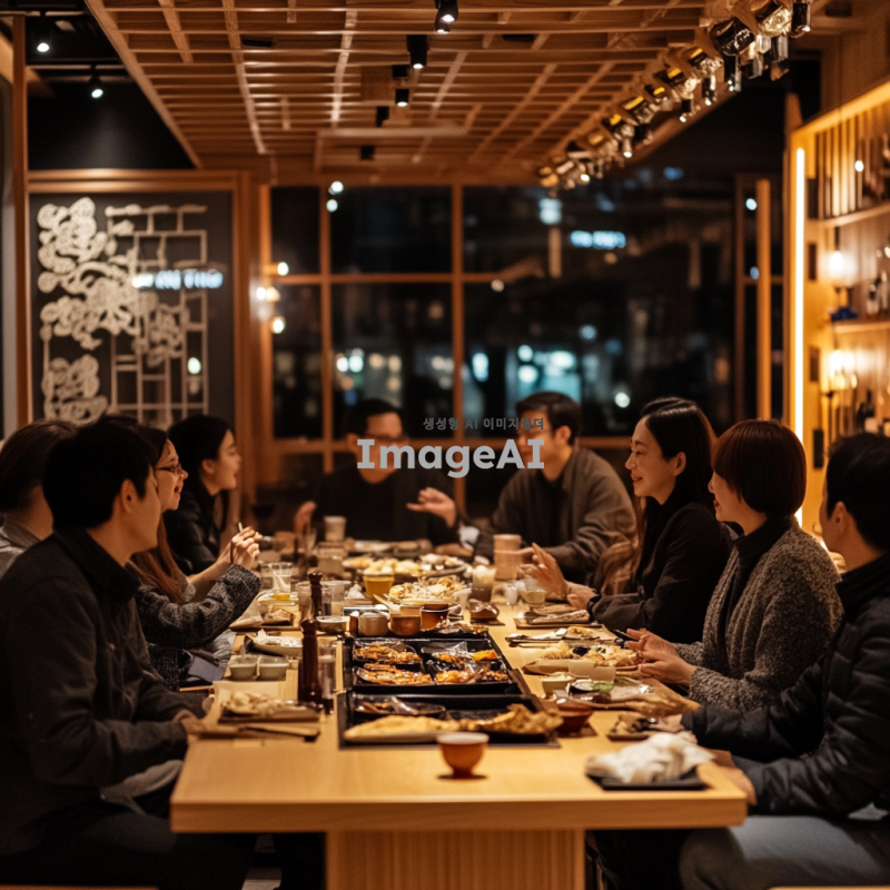 현대적인 한국식 레스토랑 내부, 긴 테이블에 둘러앉은 다양한 연령대의 사람들이 즐거운 대화를 나누고 있는 모습, 테이블 위에는 전통적인 한국 음식과 음료가 가득하고, 따뜻하고 환영하는 분위기의 조명, 사람들은 캐주얼한 옷차림으로 서로 웃고 있으며, 배경에는 한국 전통 장식이 약간 포함되어 있는 장면.