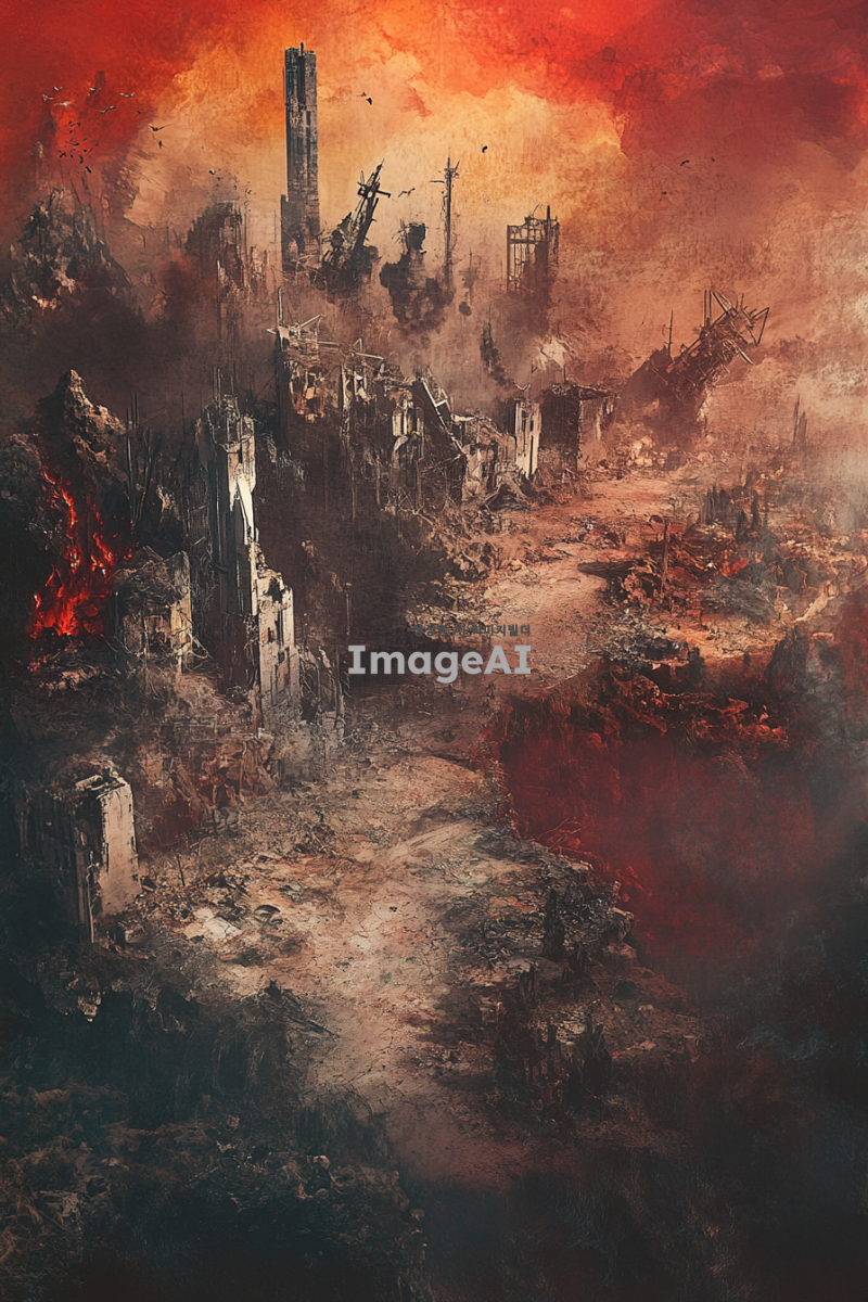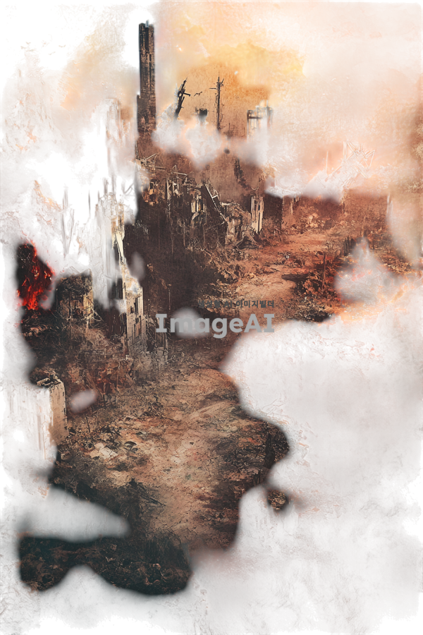 디스토피아 세계의 지도, 어두운 분위기, 황폐한 도시와 폐허가 된 건물들, 기괴한 자연환경, 고철 더미와 부서진 도로, 희미하게 보이는 공중에 떠 있는 구조물, 붉은 하늘과 짙은 안개, 미래적이면서도 쇠퇴한 느낌, 세부적인 텍스처와 디테일이 강조된 삽화 스타일, 미스터리하고 음울한 분위기, 금지된 구역
