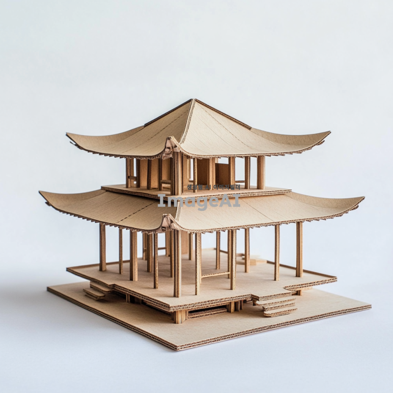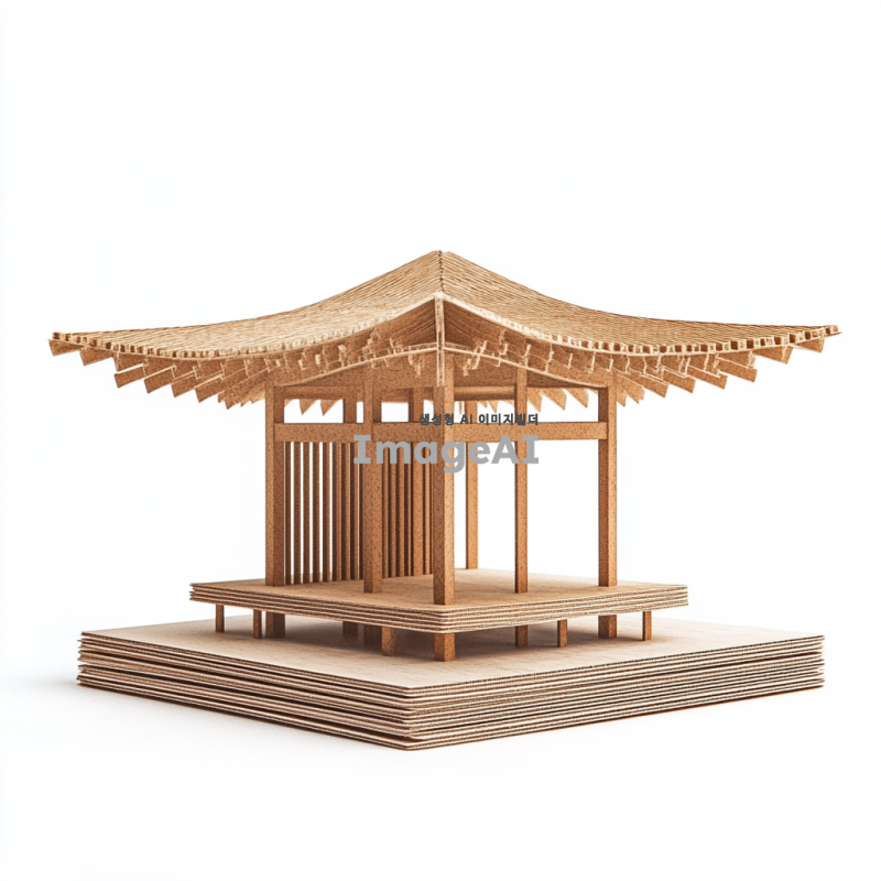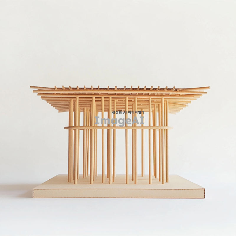 나무젓가락과 골판지를 사용하여 만든 우드 파빌리온 모델, 간단한 구조, 배경 없음, 미니멀리즘 디자인, 자연스러운 나무 질감, 창의적인 건축물, 조화로운 색상, 현대적인 느낌, 정교한 디테일, 균형 잡힌 형태.