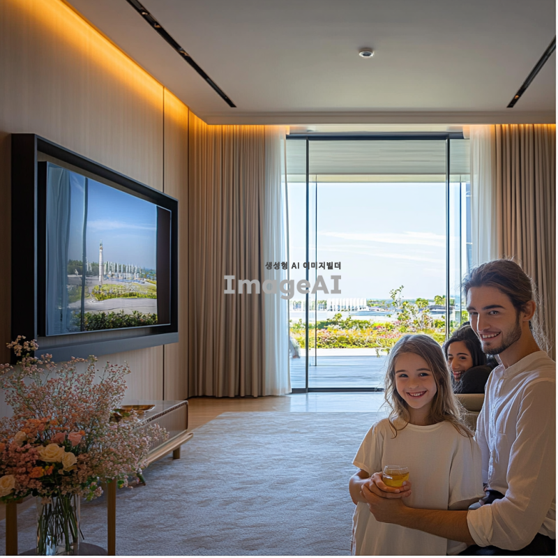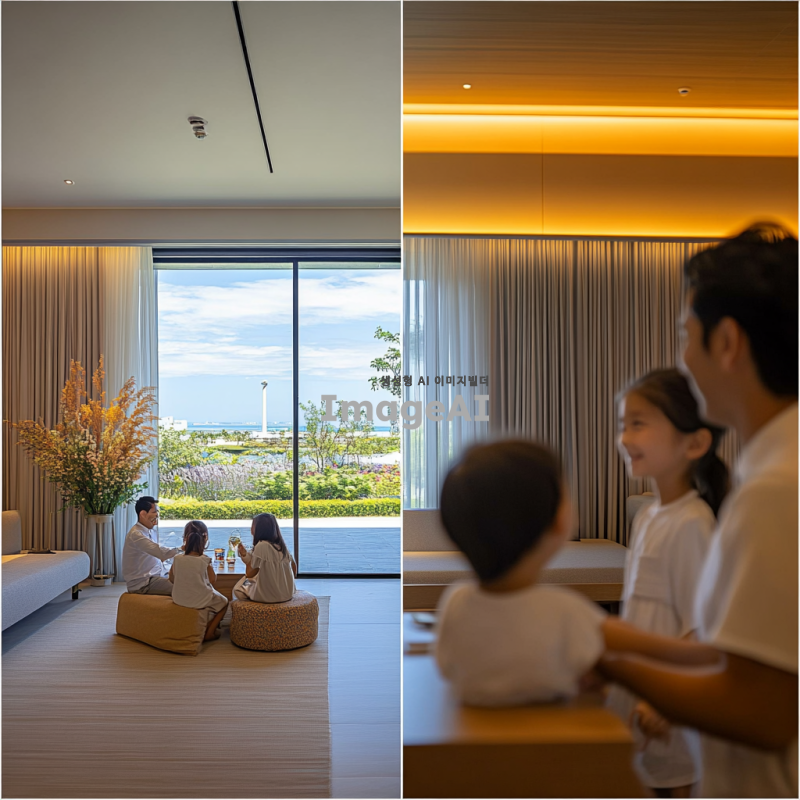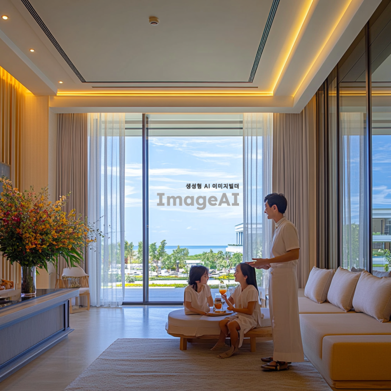 고급스러운 호텔 로비에서 환영받는 가족, 따뜻하고 친근한 분위기, 밝은 조명 아래에서 미소 짓는 가족 구성원들, 호텔 직원이 환영 인사를 하는 장면, 가족 여행의 즐거움과 편안함을 강조, 현대적이고 세련된 인테리어, 다채로운 색상의 꽃 장식, 편안한 소파와 테이블이 배치된 로비, 환영 음료가 준비된 모습, 가족 모두가 행복하게 대화를 나누는 순간.