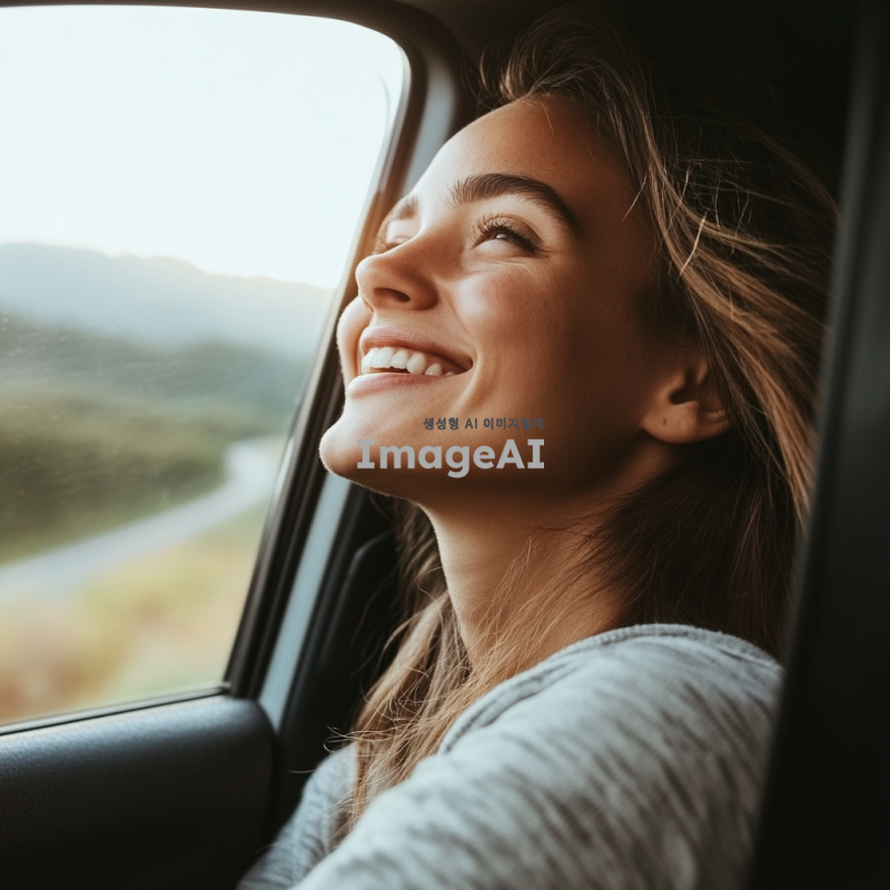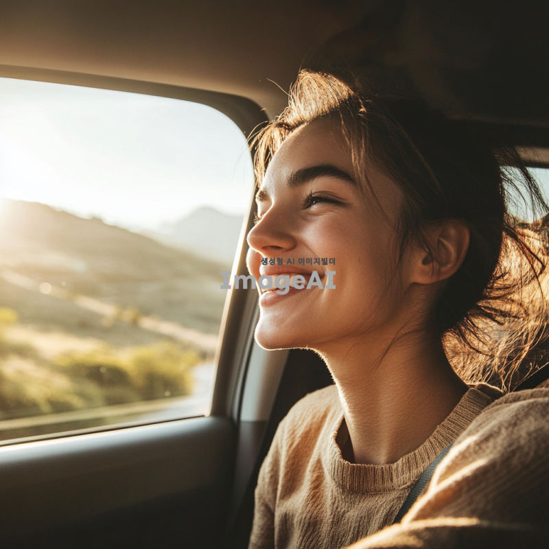 차타고 여행가는 기쁜사람. 사진구도는 창문을 보는 사람의 얼굴이 보이도록. 여행을 가서 설레고 기쁜 웃고있는사람