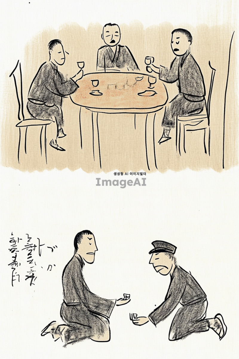 독립운동 영상 공모전에서 사용할 이미지. 자막으로 '오늘의 동료가 내일의 적이 될 수도 있고'라는 문구가 나오고 그 옆에 쓸 이미지가 필요함. 이미지는 직사각형 세로 사이즈에 2분할로 나눠서 위에는 경성시대 복장을 한 두 남자가 테이블에 앉아 서로 즐겁게 웃으며 술잔을 부딪히는 장면, 아래에는 한 남자는 일본 순사 사이에 무릎이 꿇린 채 분노한 얼굴로 자신을 내려다 보며 웃고 있는 남자를 노려보는 장면으로 그려줬으면 좋겠어.