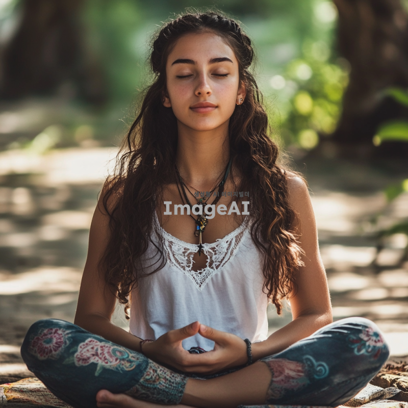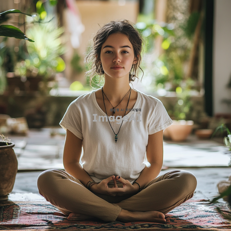 아빠다리로 편안하게 앉아있는 젊은 여성