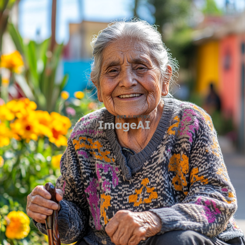 밝고 따뜻한 미소를 짓고 있는 할머니, 손에는 아름다운 조각이 새겨진 우아한 지팡이를 들고 있음, 할머니의 주름진 얼굴에는 인자함과 지혜가 느껴짐, 부드러운 햇살이 비치는 정원에서, 주변에는 다양한 꽃들이 피어 있는 장면, 할머니의 의상은 전통적인 무늬가 있는 따뜻한 색상의 스웨터와 편안한 바지, 배경은 푸른 하늘과 푸르른 나무들로 가득찬 평화로운 분위기.