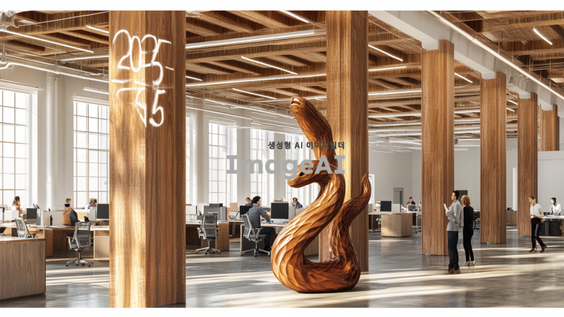 현대적인 사무실에서 다양한 사람들이 각자의 자리에서 집중하여 업무를 수행하고 있는 장면, 사무실 중앙에는 2025라는 숫자가 크게 쓰여 있고, 그 아래에는 거대한 뱀 모양의 석상이 세워져 있는 모습, 석상은 세련되고 예술적으로 조각되어 있으며, 사무실의 인테리어와 조화를 이루고 있음, 창문을 통해 자연광이 부드럽게 들어오는 분위기, 전체적인 색감은 차분하고 전문적인 느낌을 주는 톤으로 구성.