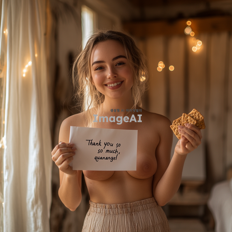 20대 중반의 보통 체형 여성이 수줍은 미소를 지으며 서 있다. 그녀는 한 손에 "수호천사 정말 감사합니다"라는 문구가 적힌 편지를 들고 있고, 다른 손에는 크레커를 들고 있다. 배경은 부드럽고 따뜻한 느낌의 실내 공간이며, 자연광이 은은하게 비치는 분위기다. 여자의 표정은 진심 어린 감사의 마음을 담고 있다.