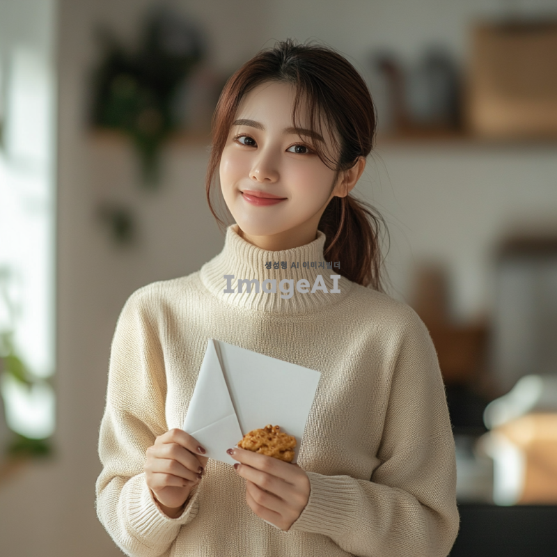 30대 중반 한국인 여성, 왼손에 편지를 들고 오른손에 과자를 들고 있는 모습, 수줍은 미소를 짓고 서 있는 장면 가정집에서 자연스러운 포즈, 캐주얼한 복장, 부드러운 조명, 배경은 심플하고 깔끔한 스타일.