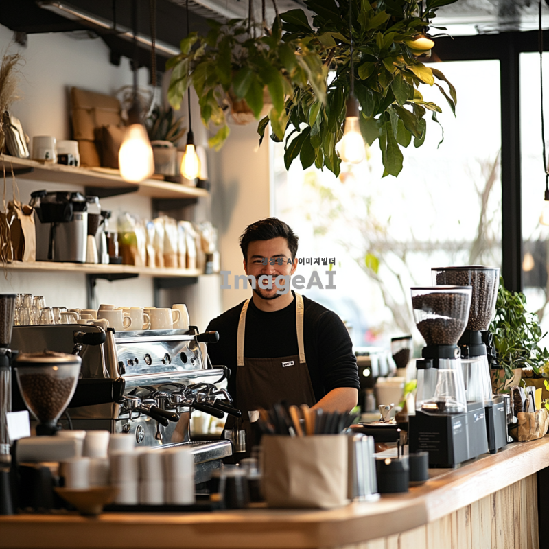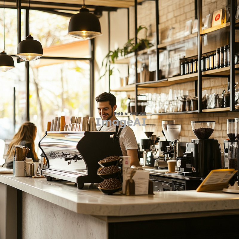성공적인 카페 사장님이 운영하는 세련된 카페 내부, 현대적이고 우아한 인테리어 디자인, 카운터 뒤에서 미소 짓는 사장님, 잘 정돈된 커피 머신과 다양한 커피 원두가 진열된 선반, 깔끔하고 아늑한 좌석 배치, 창문을 통해 들어오는 자연광, 고객들이 편안하게 대화하는 모습, 고급스러운 느낌의 장식 요소들, 사장님의 자신감 있는 표정과 프로페셔널한 분위기.
