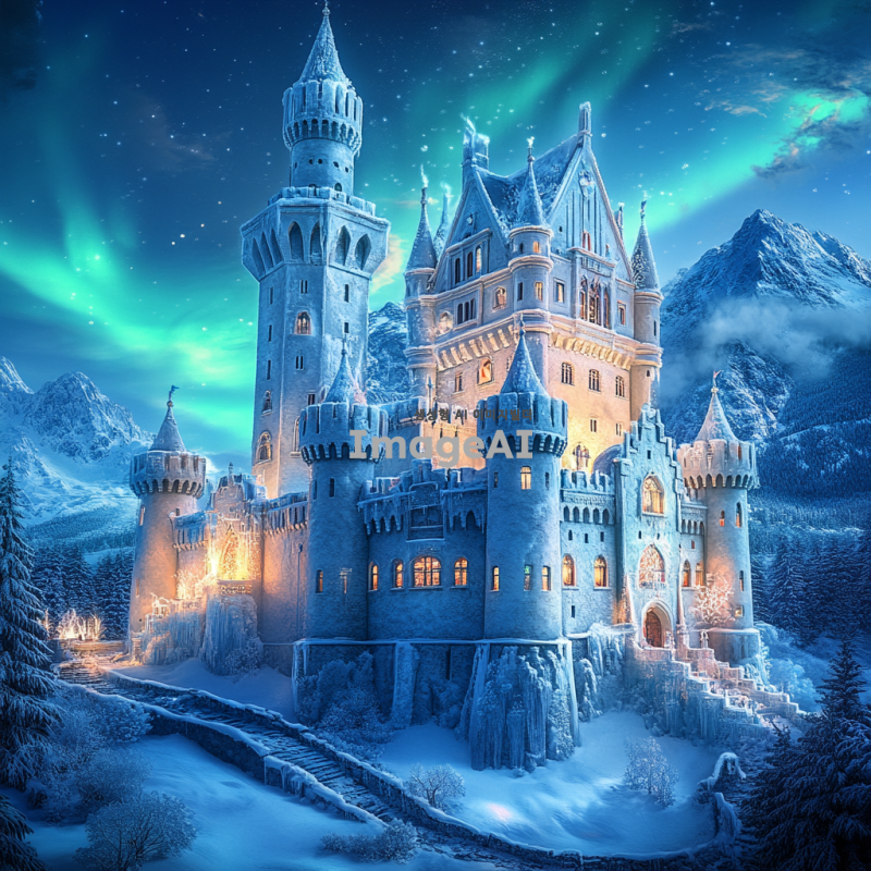 겨울의 신비로움을 담은 중세 유럽 스타일의 성, 눈 덮인 풍경 속에 자리 잡고 있으며, 성의 탑과 벽은 얼음과 눈으로 장식되어 반짝임. 주변에는 눈송이가 흩날리고, 얼음 조각으로 만들어진 정교한 조각상들이 성 주변을 둘러싸고 있음. 푸른 하늘 아래, 은은한 북극광이 하늘을 수놓고 있어 몽환적인 분위기를 자아냄. 성의 창문에서는 따뜻한 빛이 새어 나와 차가운 겨울 풍경과 대조를 이루며 아늑함을 더함.