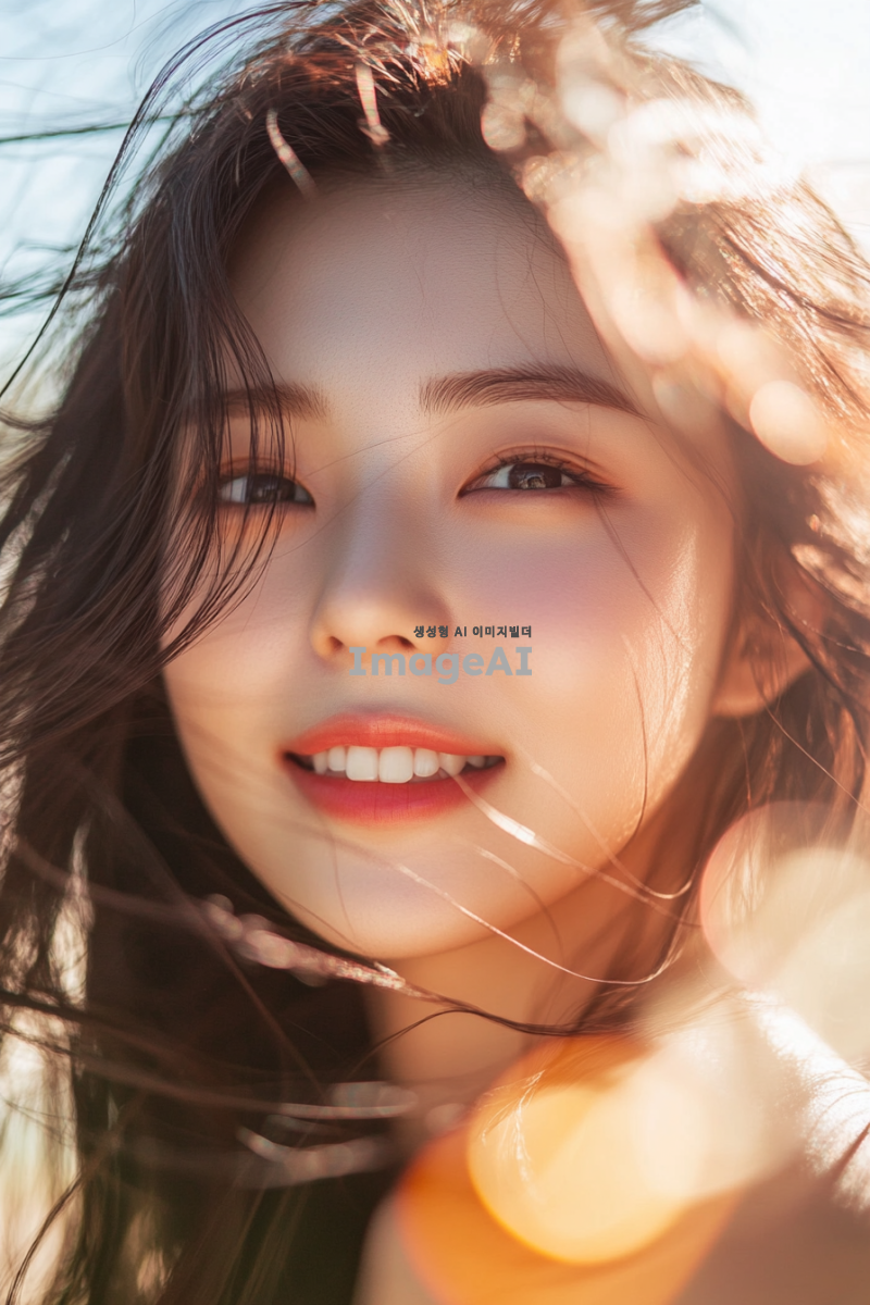 밝은 햇살 아래에서 선크림을 바른 아름다운 한국 여성이 미소를 지으며 카메라를 바라보고 있는 장면. 그녀의 피부는 건강하고 빛나며, 화장품 광고 모델인 그녀는 상반신 전체가 보인다