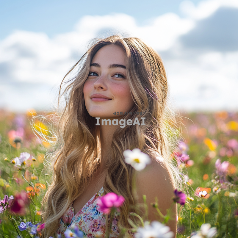 밝은 햇살 아래 꽃밭에 서 있는 아름다운 여성, 긴 웨이브 머리카락이 바람에 흩날리며, 부드러운 미소를 짓고 있다. 그녀는 화사한 봄 드레스를 입고 있으며, 주변에는 다양한 색상의 꽃들이 만개해 있다. 배경은 푸른 하늘과 흰 구름으로 이루어져 있으며, 자연의 평화로움이 느껴진다. 여성의 눈은 반짝이며, 전체적인 분위기는 따뜻하고 환영하는 느낌이다.
