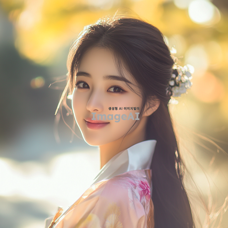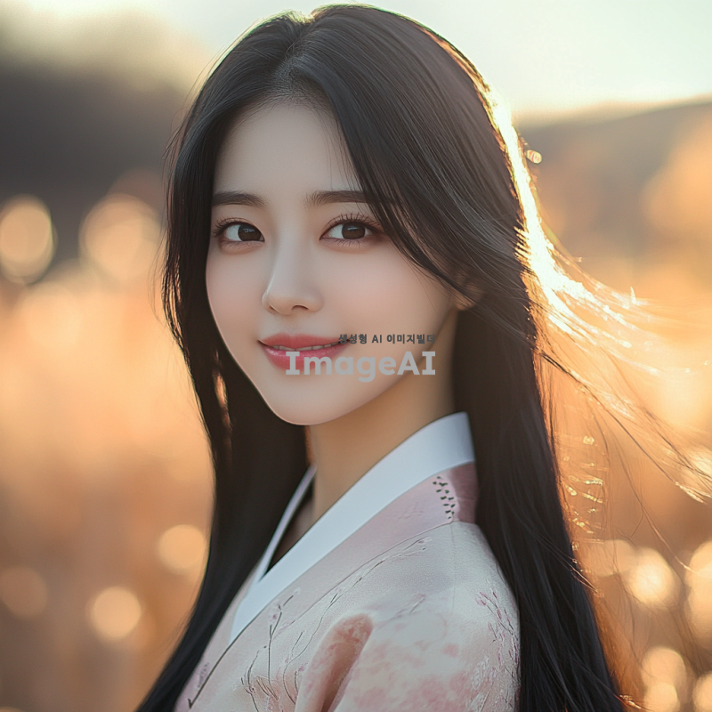 상반신이 전부 보이는 아름다운 한국 여성, 자연스럽고 부드러운 미소, 긴 검은 머리, 화사한 배경, 전통 한국 의상 한복을 입고 있는 모습, 따뜻한 햇살이 비치는 야외에서 촬영한 느낌, 현대적이면서도 전통적인 아름다움이 조화롭게 어우러진 이미지.