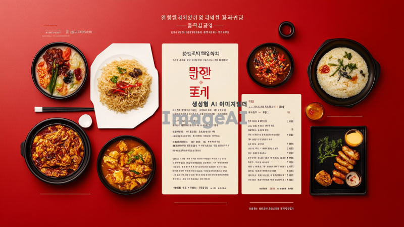 한국 스타일의 중식당 메뉴판, 빨간색을 주요 색상으로 사용하여 전통적인 중식당의 분위기를 강조. 메뉴 항목으로는 짜장면, 짬뽕, 볶음밥, 탕수육 등을 포함하며, 각 요리의 이미지와 함께 한글로 메뉴 이름과 가격이 명확하게 표시. 메뉴판의 레이아웃은 깔끔하고 직관적이며, 각 요리의 이미지가 식욕을 돋울 수 있도록 생생하고 맛있게 표현. 전통적인 중식당의 느낌을 살리기 위해 붉은색 배경에 금색이나 흰색 글씨를 사용하여 고급스러운 느낌을 더함.