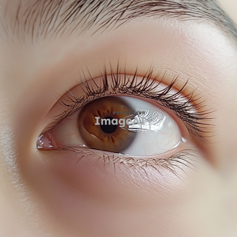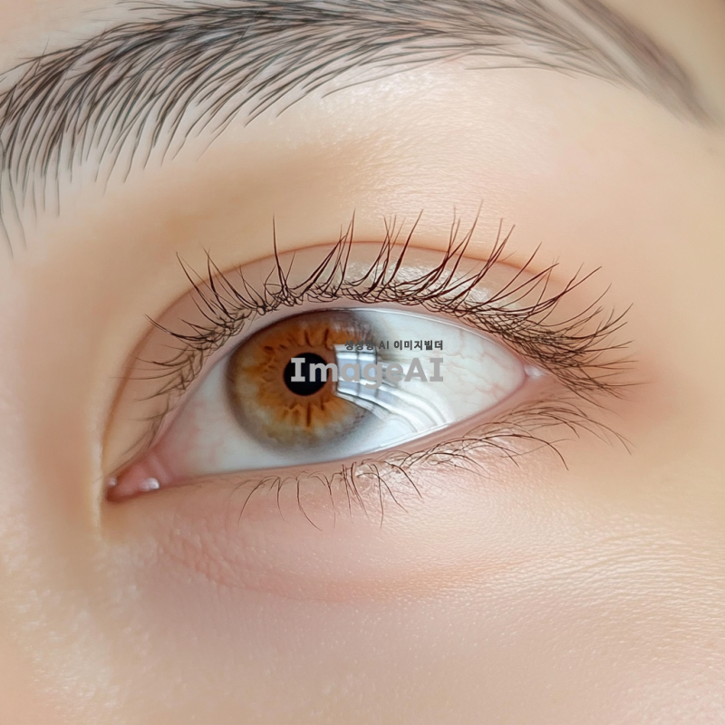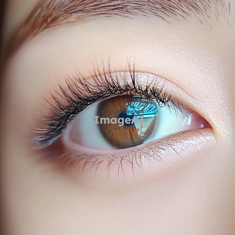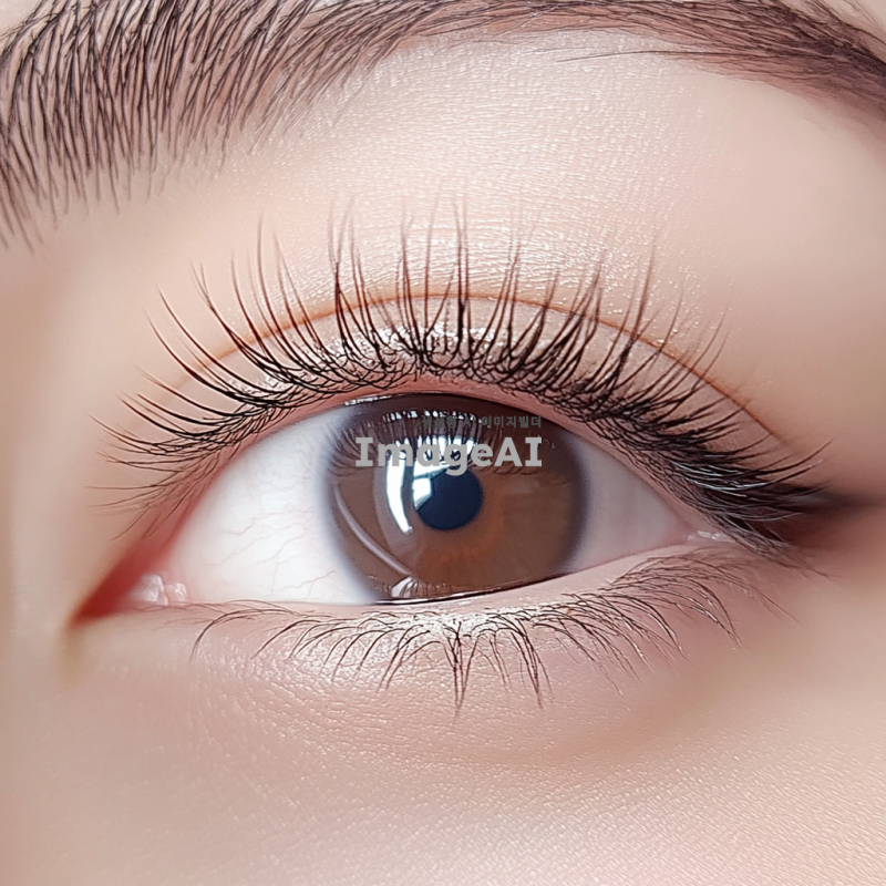속눈썹이 C컬로 올라가있고 속눈썹숱이 많이 있고 눈을 클로즈업한