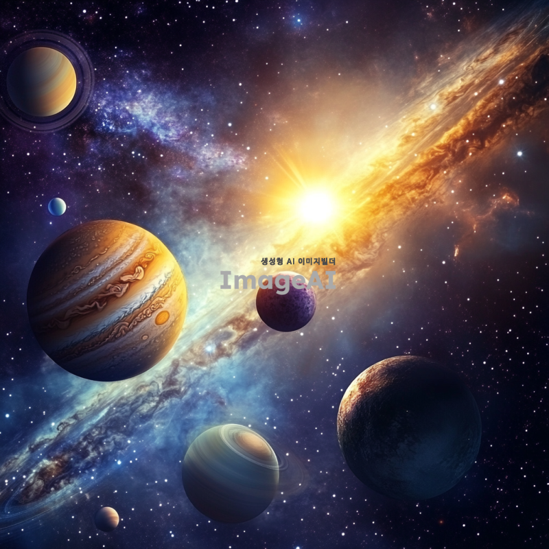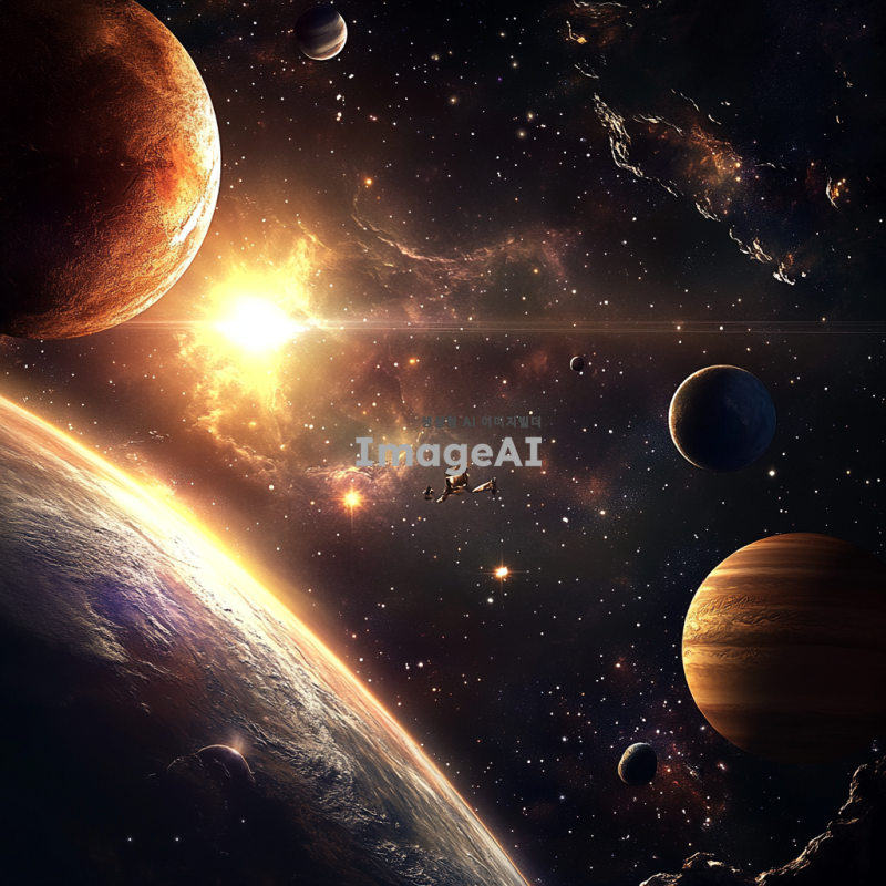 태양계를 배경으로 한 우주 장면, 각 행성이 선명하게 보이며 태양의 빛이 은은하게 비추는 모습, 행성들의 크기와 색상이 실제와 유사하게 표현된 장면, 깊고 어두운 우주 공간에 별들이 반짝이는 디테일, 현실적이면서도 약간의 예술적 터치가 가미된 이미지.