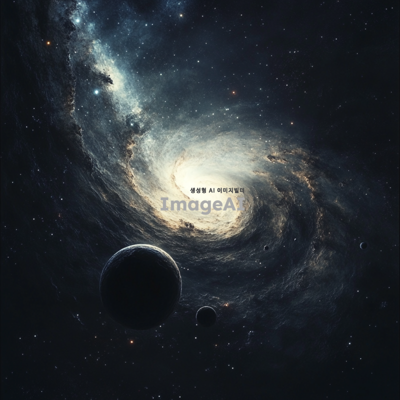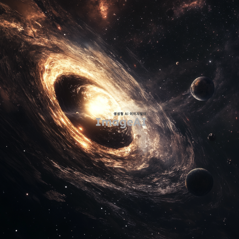 우주 공간에 떠 있는 블랙홀 행성계, 주변에 회전하는 다양한 크기의 행성들, 강렬한 중력에 의해 휘어진 빛, 은하수와 별들이 배경에 펼쳐진 모습, 신비롭고 장엄한 분위기, 어두운 색조와 강렬한 대비, 과학적이면서도 예술적인 표현.
