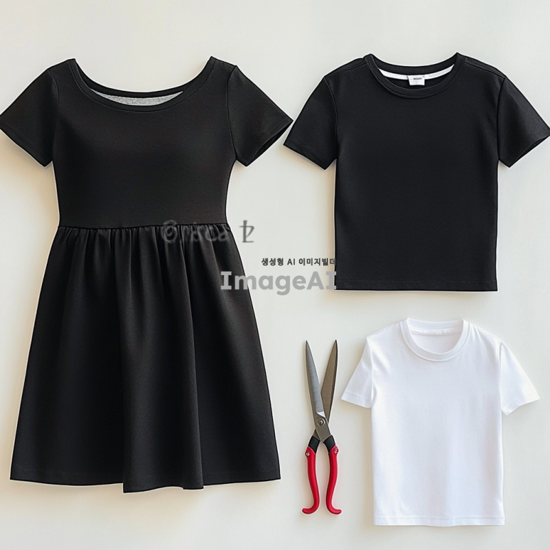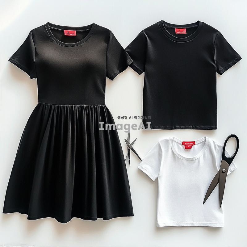 검은색 원피스와 검은색 반팔 티셔츠, 흰색 반팔 티셔츠가 나란히 놓여 있는 이미지. 각 의류는 가위로 잘린 부분이 명확하게 보이도록 표현. 배경은 깔끔한 흰색으로 설정하고, 각 의류의 질감과 색상이 선명하게 드러나도록 강조. 가위는 의류 옆에 놓여 있으며, 잘린 부분의 디테일이 잘 보이도록 세밀하게 묘사.