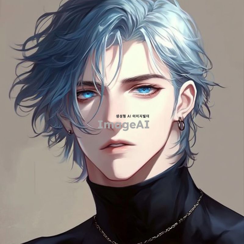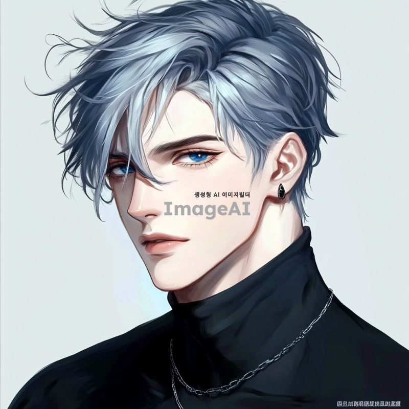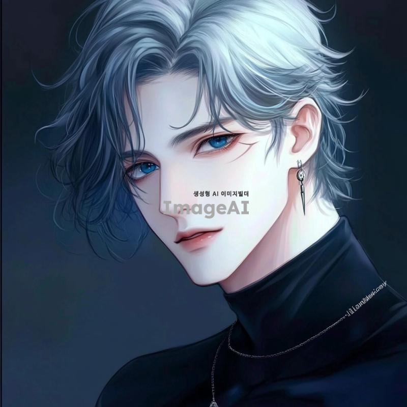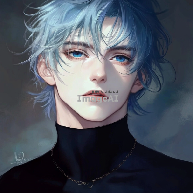 푸른빛이 도는 머리카락, 푸른 눈, 이미지와 비슷한 그림체의 잘생긴 남자 캐릭터, 옷은 검은 목티