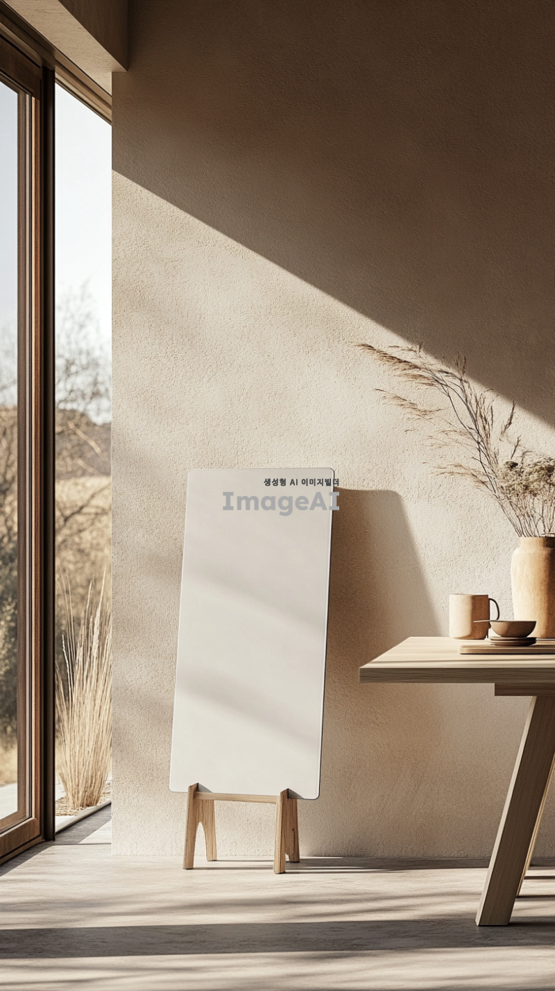 A형 철제 입간판, 손잡이 없이 일체형으로 제작된 깔끔한 디자인, 매끄러운 표면과 견고한 구조, 현대적이고 미니멀한 스타일, 실내외 사용 가능, 중성적인 색상 팔레트, 직선적이고 간결한 라인, 주변 환경과 조화롭게 어우러지는 모습, 실용적이고 세련된 느낌.