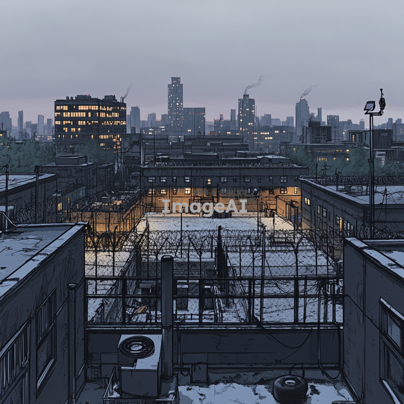 황혼의 빛이 감도는 하늘 아래, 높은 건물들과 철조망으로 둘러싸인 교도소의 전경. 옥상에서 내려다본 시점으로, 넓게 펼쳐진 교도소 안의 운동장과 여러 시설물들이 보이며, 주변에는 경비 초소와 감시카메라가 배치되어 있다. 건물들은 주로 회색이나 짙은 색조로 표현되어 있으며, 차가운 느낌을 주는 강철과 콘크리트 재질이 돋보인다. 전체적으로 고요하면서도 긴장감이 감도는 분위기.