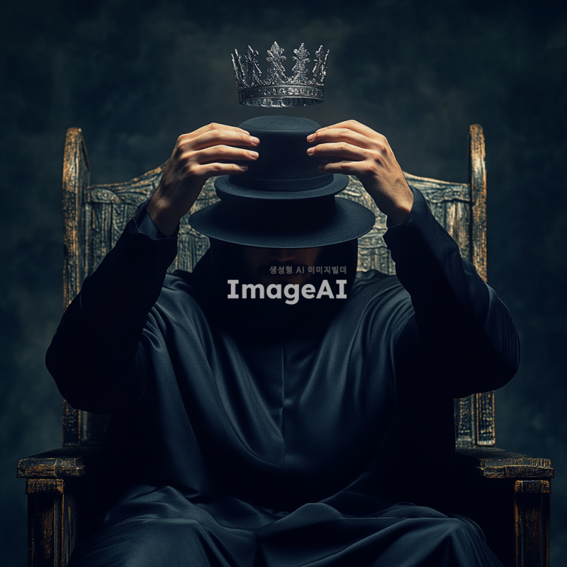검은 모자를 쓴 익명의 남자가 왕좌에 거만하게 앉아 있는 모습, 남자는 머리 위로 왕관을 들고 있으며, 주변은 어두운 배경으로 둘러싸여 있다. 왕좌는 고급스러운 디자인으로, 남자의 자세는 자신감과 권력을 상징한다. 전체적인 분위기는 중세의 웅장함과 현대적인 미스터리를 결합한 느낌으로 표현한다.