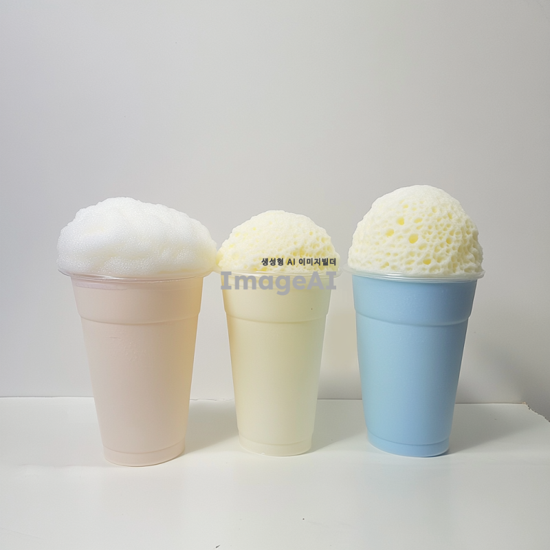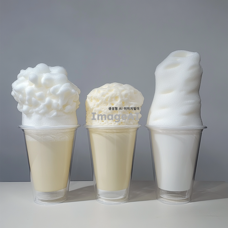 다섯 개의 컵이 나란히 놓여 있으며, 각 컵에는 서로 다른 밀도의 우레탄 발포가 채워져 있는 모습. 첫 번째 컵은 가장 낮은 밀도의 발포가 가득 차 있으며, 다섯 번째 컵은 가장 높은 밀도의 발포가 들어있음. 각 컵의 발포는 색상이나 질감으로 밀도의 차이를 시각적으로 표현. 컵은 투명한 유리로 되어 있어 내부의 발포 상태가 잘 보임. 배경은 깔끔하고 단순하게 설정하여 컵과 발포의 디테일이 돋보이도록 함.