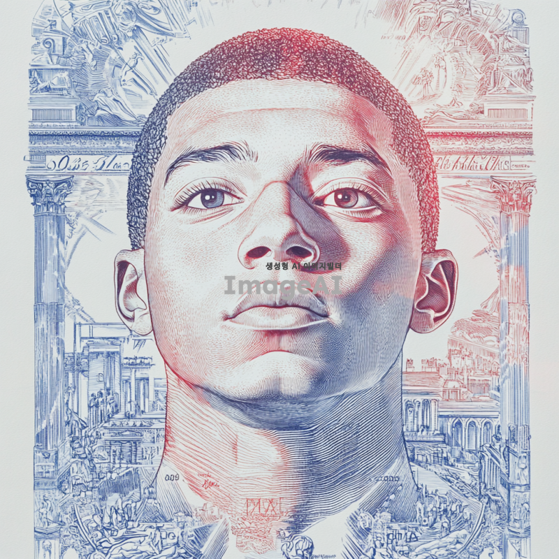 프랑스의 전통적인 디자인 요소와 현대적인 스타일이 조화를 이룬 지폐에 킬리안 음바페의 초상화가 중앙에 배치된 이미지. 음바페의 얼굴은 세밀하게 묘사되어 있으며, 배경에는 프랑스의 상징적인 건축물과 자연 경관이 섬세하게 그려져 있다. 지폐의 색상은 프랑스 국기를 연상시키는 파란색, 흰색, 빨간색의 조화를 이루고 있으며, 지폐의 모서리에는 프랑스의 유명한 문화적 아이콘들이 작게 장식되어 있다. 음바페의 이름과 숫자, 그리고 프랑스의 공식 문양이 지폐의 양쪽에 균형있게 배치된 모습.
