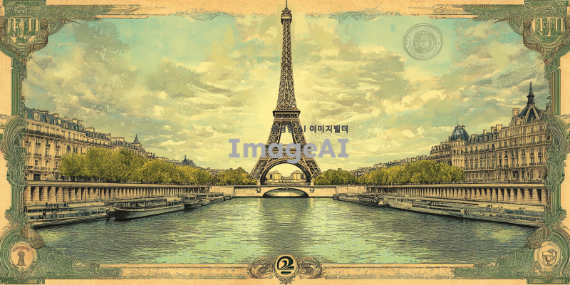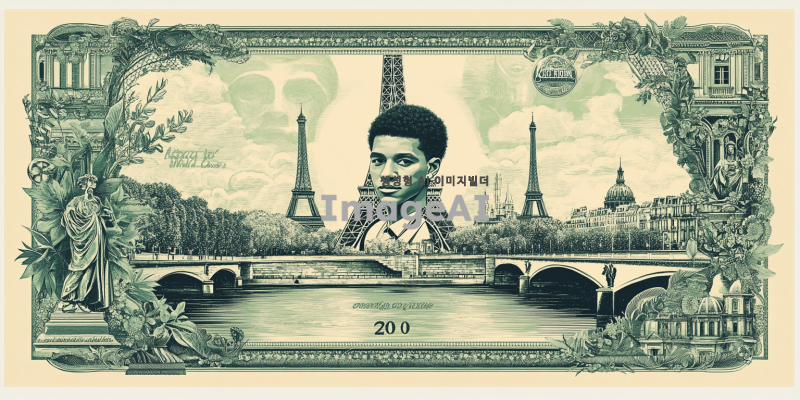 프랑스의 전통적인 지폐 디자인 스타일로, 중앙에는 킬리안 음바페의 초상화가 세밀하게 그려져 있고, 배경에는 프랑스의 상징적인 랜드마크인 에펠탑과 세느강이 조화롭게 배치된 200프랑짜리 지폐. 지폐의 색상은 클래식한 녹색과 푸른색 톤을 사용하여 전통적인 유럽 지폐의 느낌을 강조하고, 음바페의 초상화는 현대적인 터치로 세부 묘사를 통해 생동감 있게 표현. 지폐의 가장자리에는 프랑스의 국가 문양과 역사적인 요소들이 세밀하게 장식되어 있는 모습.