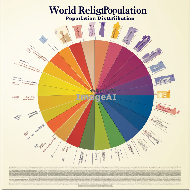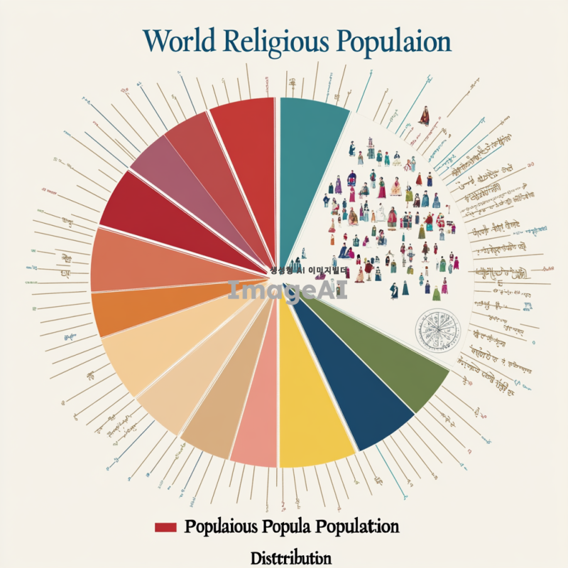 종교별 인구 수를 나타내는 원형 차트, 각 종교는 다른 색으로 구분되어 있으며, 기독교, 무슬림, 힌두교, 불교, 중국 민속 종교, 민족 종교, 신흥 종교, 시크교, 유대교 순으로 배열되어 있다. 차트 중앙에는 "세계 종교 인구 분포"라는 제목이 적혀 있다.