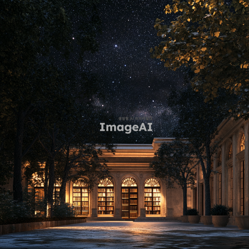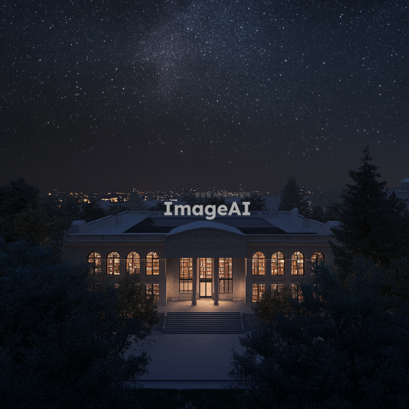 늦은 밤, 어두운 하늘 아래 별들이 반짝이는 가운데, 고요한 분위기의 지붕 위에서 내려다본 교도서의 전경. 교도서는 고풍스러운 건축 양식으로 지어졌으며, 주변에는 나무들이 그림자처럼 둘러싸여 있다. 교도서 창문에서 은은한 조명이 새어나오고, 멀리 보이는 도시의 불빛이 희미하게 반사되어 있다. 밤의 차분한 정취와 고요함이 느껴지는 장면.