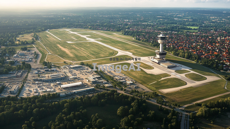 맑은 하늘 아래 펼쳐진 전원 마을과 넓은 밭, 오른쪽 끝에 위치한 항공 관제탑, 조화롭게 어우러진 풍경, 초록빛으로 물든 들판과 작은 집들이 점점이 놓인 모습, 평화롭고 조용한 분위기, 관제탑은 현대적인 디자인으로 강조, 전체적으로 따뜻한 색감과 부드러운 빛이 감도는 장면.