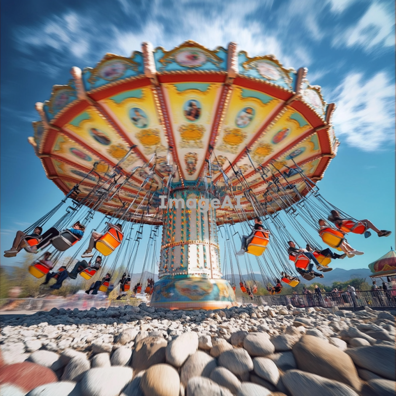 공중에서 사람들이 날아다니는 다채로운 놀이공원 놀이기구로, 바위와 조약돌 위에 있으며, 모션 블러가 있는 사진처럼 사실적인 스타일입니다.