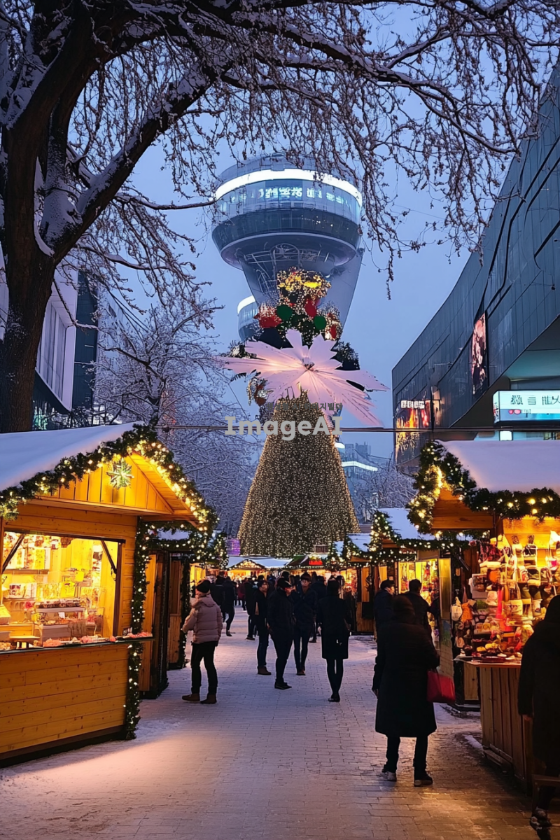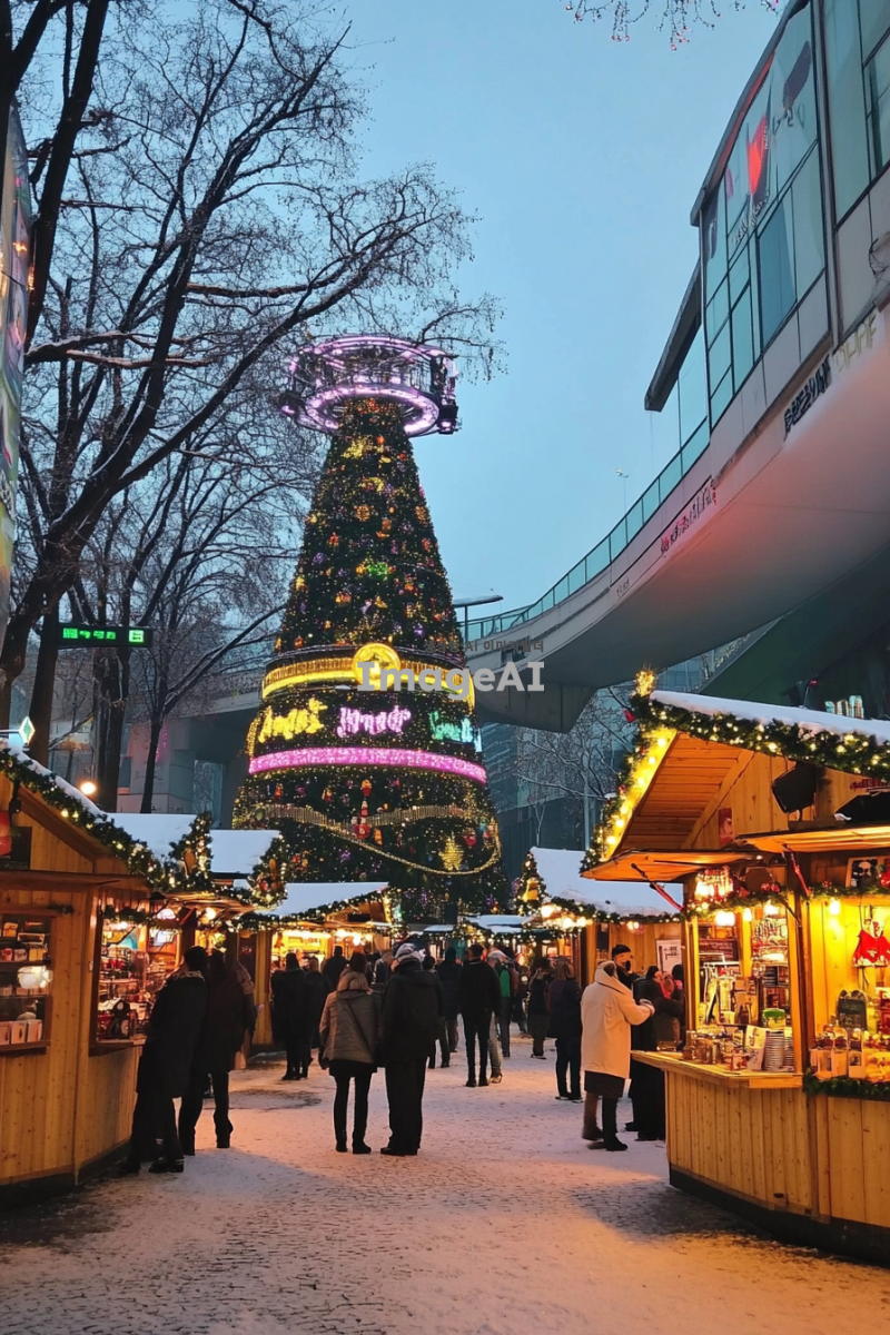눈 내리는 겨울 풍경 속에 활기찬 크리스마스 마켓, 다양한 크리스마스 조명과 장식들로 가득한 거리, 따뜻한 음료와 간식을 제공하는 작은 나무 오두막들, 사람들이 즐거운 표정으로 쇼핑하고 있는 모습, 전통적인 유럽 스타일의 크리스마스 장식과 함께 반짝이는 트리, 가족과 친구들이 함께 즐길 수 있는 놀이기구와 공연, 따뜻한 분위기의 크리스마스 음악이 흐르는 배경, 런던과 파리의 크리스마스 마켓 특유의 분위기를 반영한 다양한 문화적 요소들.