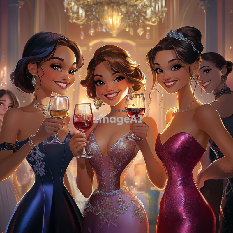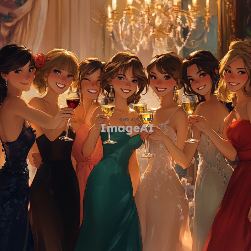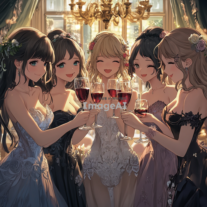 화려한 드레스를 입은 미소녀들이 우아한 파티에서 와인잔을 들고 웃으며 건배하는 장면, 배경은 럭셔리한 실내 공간, 조명은 부드럽고 따뜻한 분위기, 각 인물은 다양한 드레스 색상과 스타일로 개성을 표현, 미소녀들의 생동감 넘치는 표정과 함께 즐거운 분위기 강조.