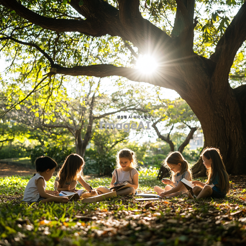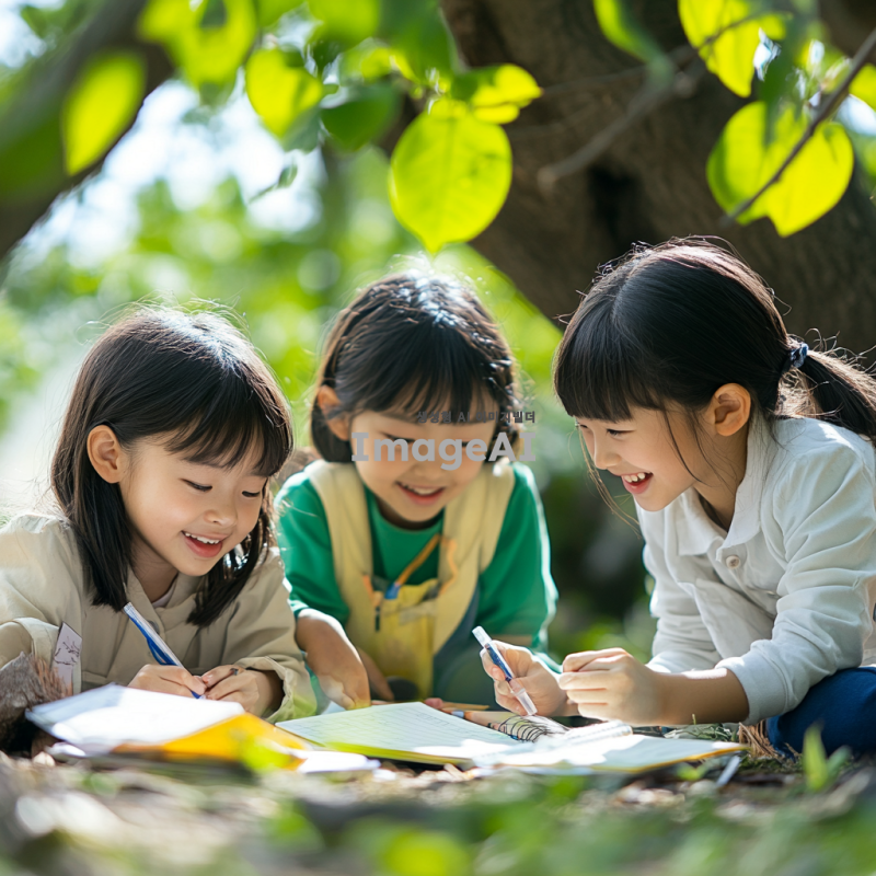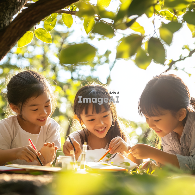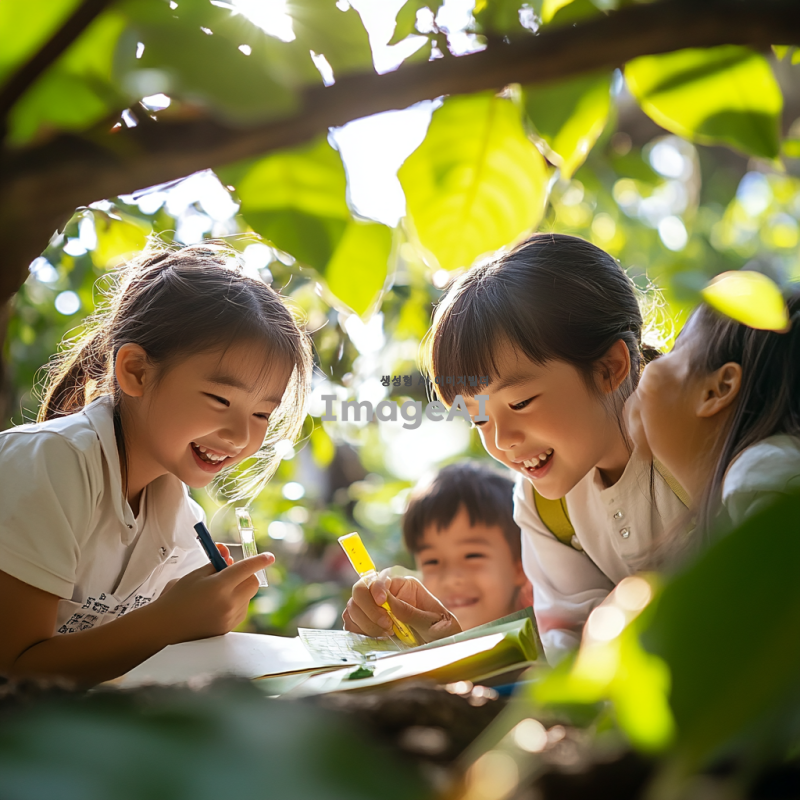 느티나무 아래에서 과학 실험을 하고 있는 아이들, 밝고 활기찬 분위기, 나무의 넓은 그늘 아래에서 다양한 실험 도구와 노트를 사용하며 미소를 짓고 있는 모습, 아이들의 눈에는 호기심과 열정이 가득하며, 주변에는 자연의 아름다움이 어우러져 있는 장면, 따뜻한 햇살이 느티나무 잎 사이로 부드럽게 비치는 모습, 아이들의 성장과 배움의 순간을 포착한 장면.