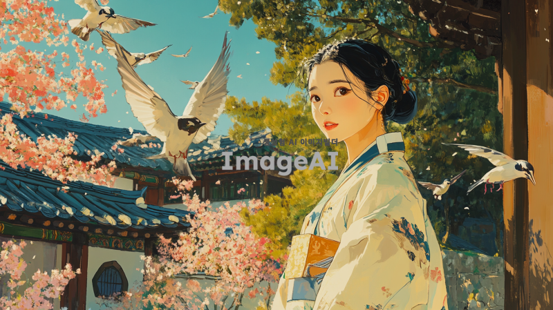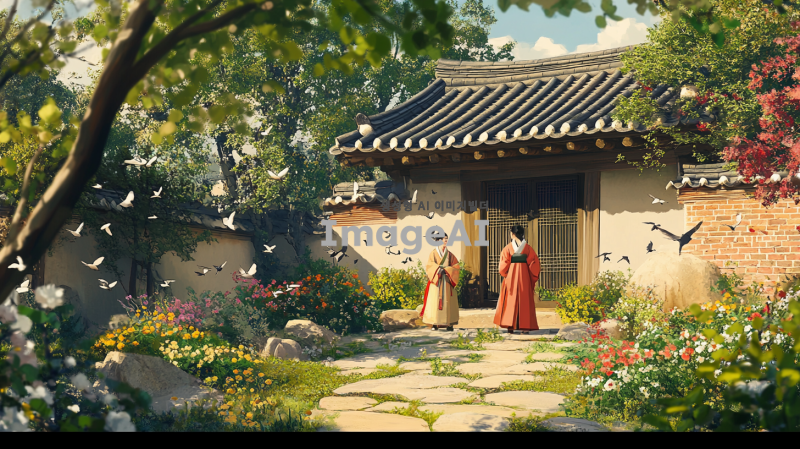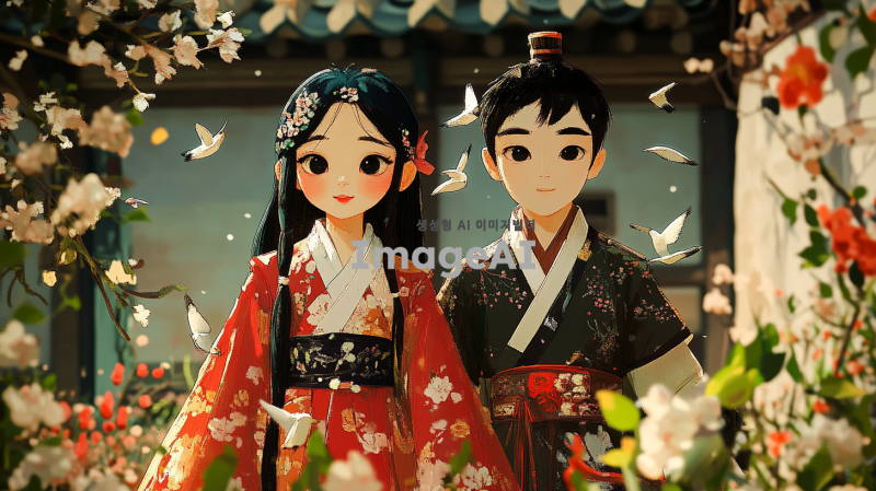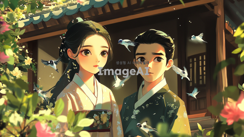 한국 전통 민속 설화의 한 장면을 묘사하듯, 흥부와 놀부가 등장하는 장면을 그린다. 흥부는 온화하고 선량한 표정으로, 전통 한복을 입고 있으며, 그의 주변에는 작은 제비들이 날아다닌다. 놀부는 탐욕스럽고 약간은 불만스러운 표정으로, 부유함을 상징하는 화려한 한복을 입고 있다. 배경은 조선시대의 전통적인 한옥 마당으로, 주변에는 꽃과 나무들이 풍성하게 자리잡고 있다. 전체적인 분위기는 따뜻하고 생동감 넘치는 색감으로 표현된다.