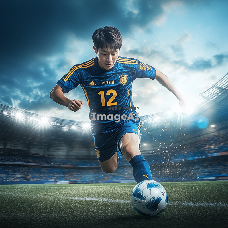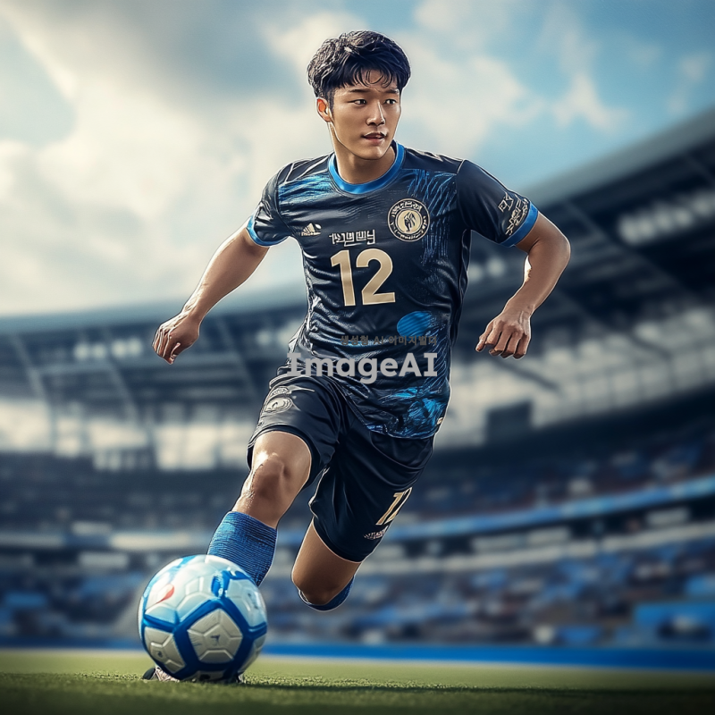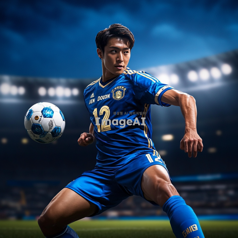 인천유나이티드 유니폼을 입고 축구공을 향해 슈팅 자세를 취하고 있는 남자 선수, 등번호 12번이 선명하게 보이고, 이름은 전도원이 유니폼 뒷면에 적혀 있음, 경기장 배경, 역동적인 포즈, 자연스러운 조명과 그림자, 현실적인 인물 묘사.