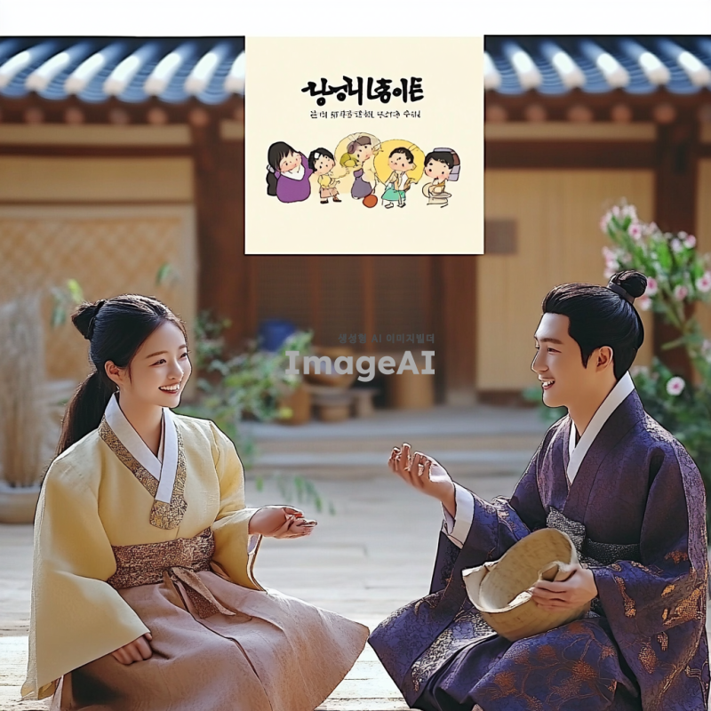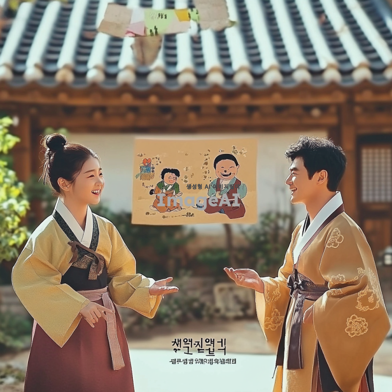 조선 시대의 전통 한옥 마당에서 흥부와 놀부가 서로 대화를 나누고 있는 장면. 흥부는 인자하고 친절한 표정을 짓고 있으며, 간소하지만 깨끗한 한복을 입고 있고 가난하지만 마음씨가 착하고 남을 돕는 것을 좋아하는 동생. 놀부는 약간 오만한 표정을 짓고 있으며, 화려한 무늬의 한복을 입고 있고 부유하지만 욕심 많고 심술궂으며 남을 괴롭히는 형. 배경에는 고풍스러운 기와 지붕과 대나무가 심어진 정원이 보인다. 햇살이 따스하게 비추는 오후의 분위기, 전통적인 한국의 농촌 마을의 평화로운 느낌을 강조.