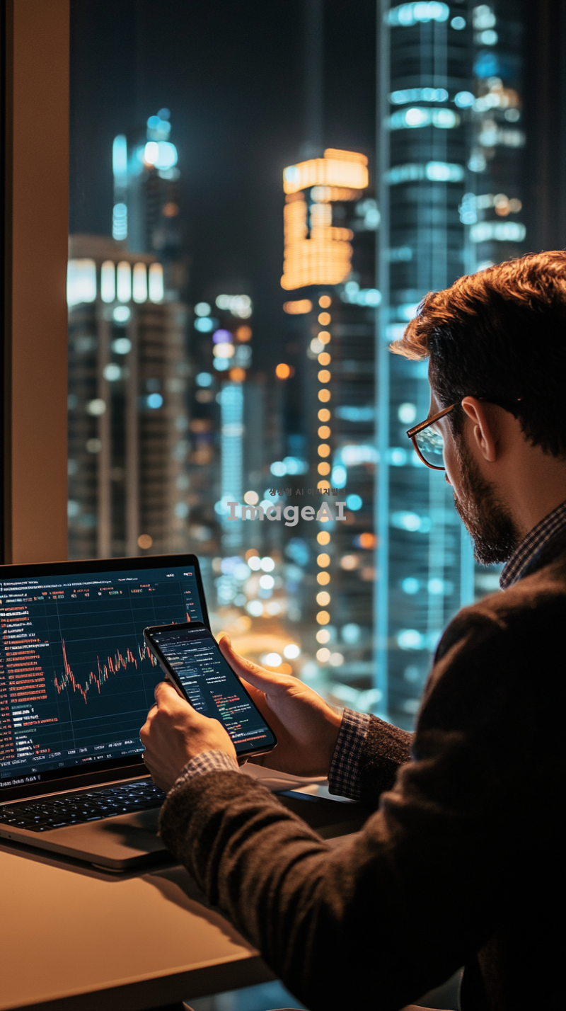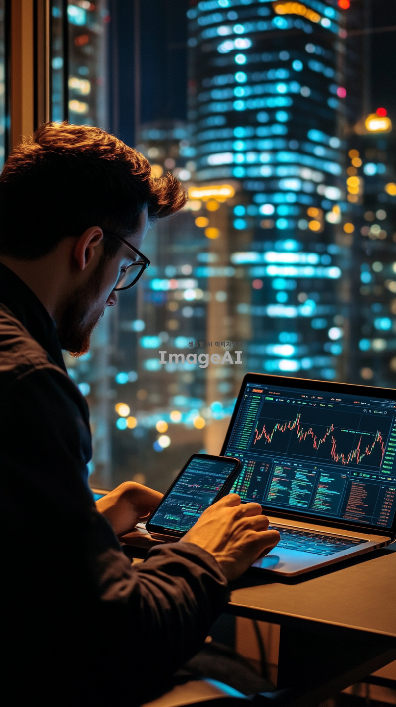 현대적이고 세련된 사무실에서 노트북 화면에 코인 가격 차트를 보며 집중하는 남성, 그의 손에는 스마트폰이 들려있고, 화면에는 암호화폐 거래 애플리케이션이 열려 있음. 주변에는 최신 기술 장비와 깔끔한 인테리어가 배치되어 있으며, 창밖으로는 도시의 스카이라인이 보임. 조명은 자연광과 인공 조명이 조화를 이루며 밝고 활기찬 분위기를 연출.