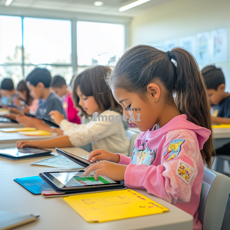 밝고 현대적인 학원 교실에서 여러 명의 아이들이 각자 태블릿 PC를 사용하며 공부하고 있는 장면. 아이들은 다양한 인종과 성별로 구성되어 있으며, 집중하고 있는 모습. 교실은 깔끔하고 정돈되어 있으며, 창문을 통해 자연광이 들어오는 따뜻한 분위기. 최신 기술을 활용한 학습 환경을 강조하여, 책상 위에는 태블릿과 함께 필기 도구와 노트가 놓여 있음. 아이들은 서로 소통하거나 개별적으로 학습에 몰두하는 모습으로, 교육의 미래를 보여주는 장면.