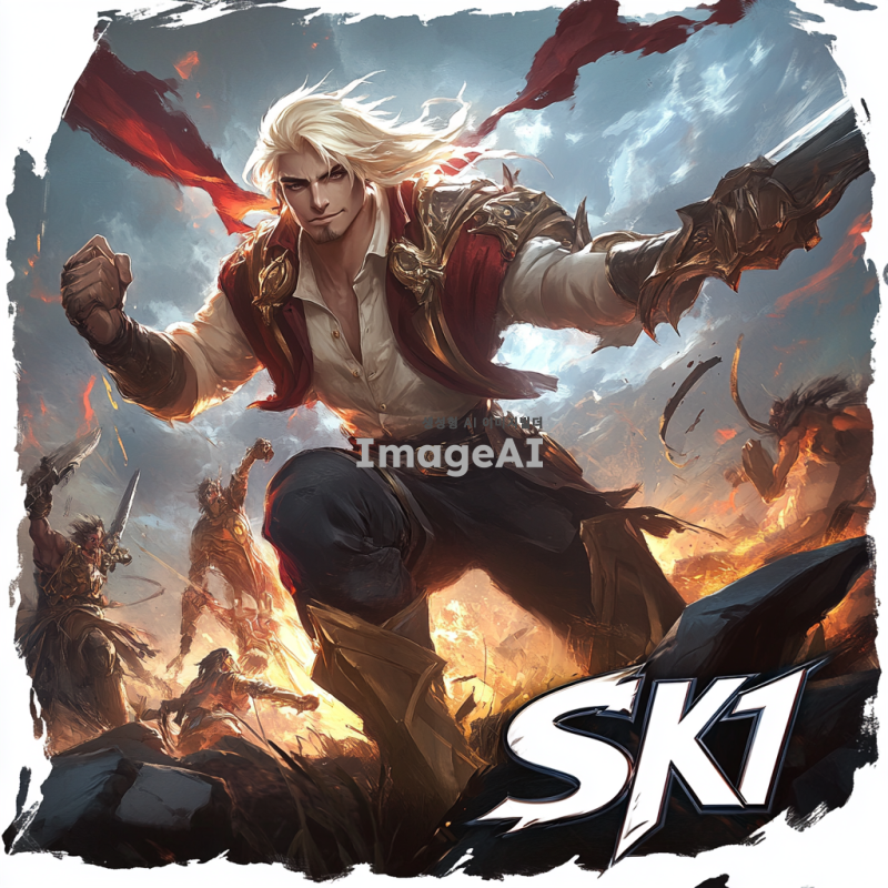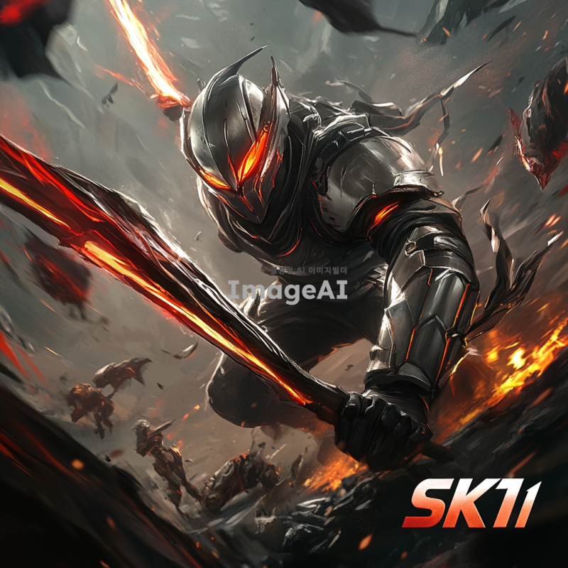 SKT1 팀 유니폼을 입고 있는 잭스, 전투 후 승리의 포즈를 취하며 주변에 적 챔피언들이 쓰러져 있는 장면, 역동적이고 강렬한 조명 아래에서 잭스의 무기가 빛나고 있는 모습, 배경은 리그 오브 레전드의 소환사의 협곡, SKT1 로고가 강조된 디자인 요소, 현대적이고 세밀한 아트 스타일.