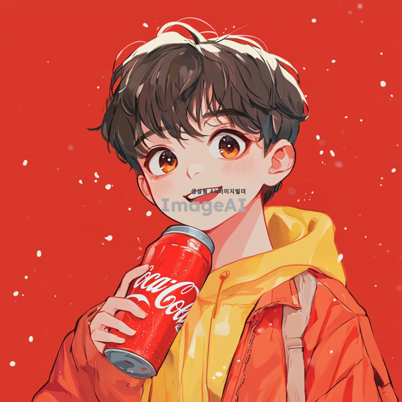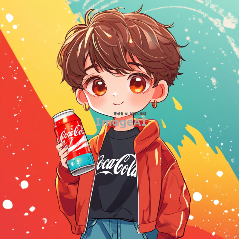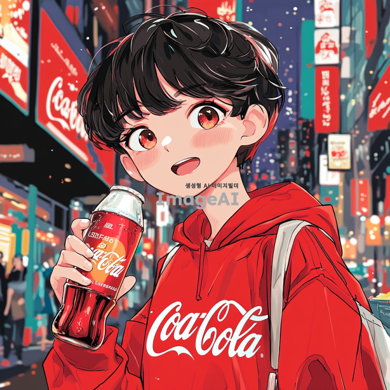 웹툰 스타일의 귀여운 남자아이, 코카콜라를 들고 있는 장면, 밝고 활기찬 분위기, 큰 눈과 미소를 가진 캐릭터, 생동감 있는 컬러 팔레트, 현대적인 의상과 배경, 청량감을 주는 요소들 포함.