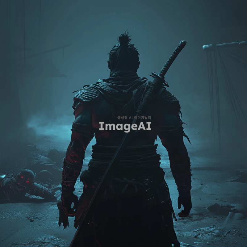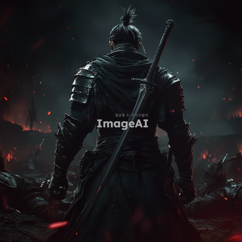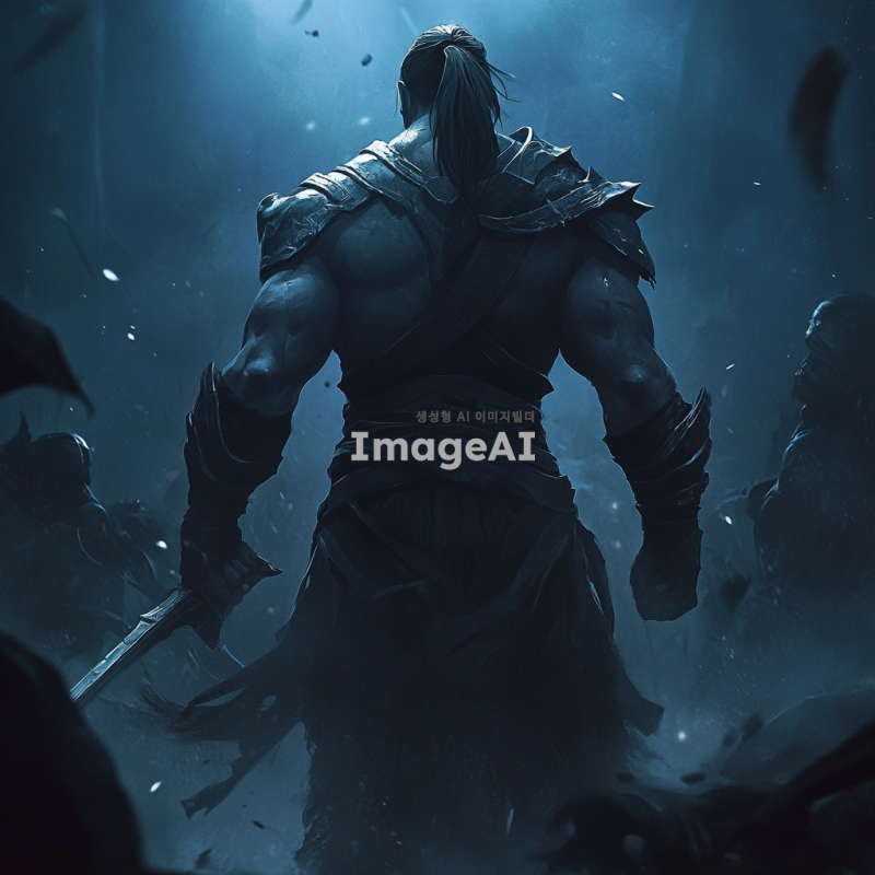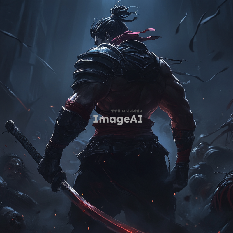 어두운 전장 배경, 쓰러진 야스오와 요네의 시체가 보이는 가운데, 전투에서 승리한 잭스가 늠름하게 서 있는 모습. 잭스의 뒷모습은 강력하고 자신감 넘치는 자세로, 그의 손에는 무기가 들려 있으며, 주변에는 전투의 흔적이 남아있는 분위기. 잭스의 갑옷과 무기는 전투의 흔적을 보여주며, 전장에는 희미한 안개와 전투의 긴장감이 감도는 분위기.