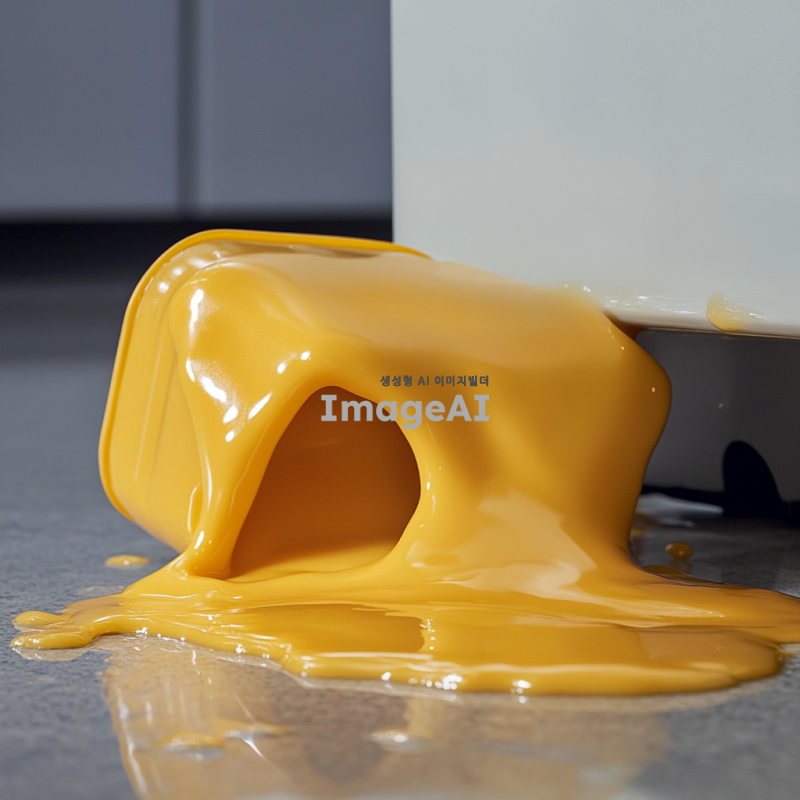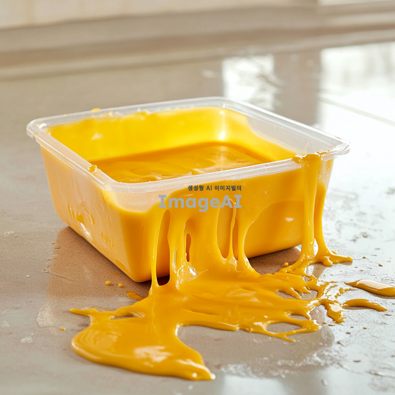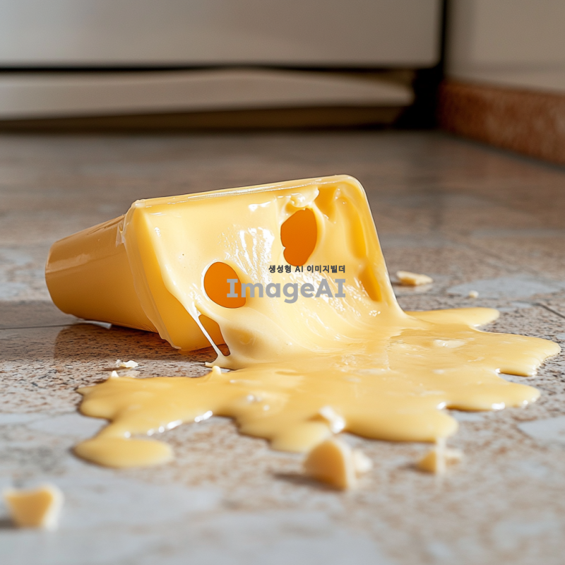 플라스틱 용기에 담겨져 있는 녹아 있는 치즈가 냉장고 안에서 꺼내다가 바닥으로 떨어져 플라스틱 용기는 뒤집어져 있고 걸쭉한 액체 형태의 치즈가 바닥에 엎질러져 있는 상황을 그려줘