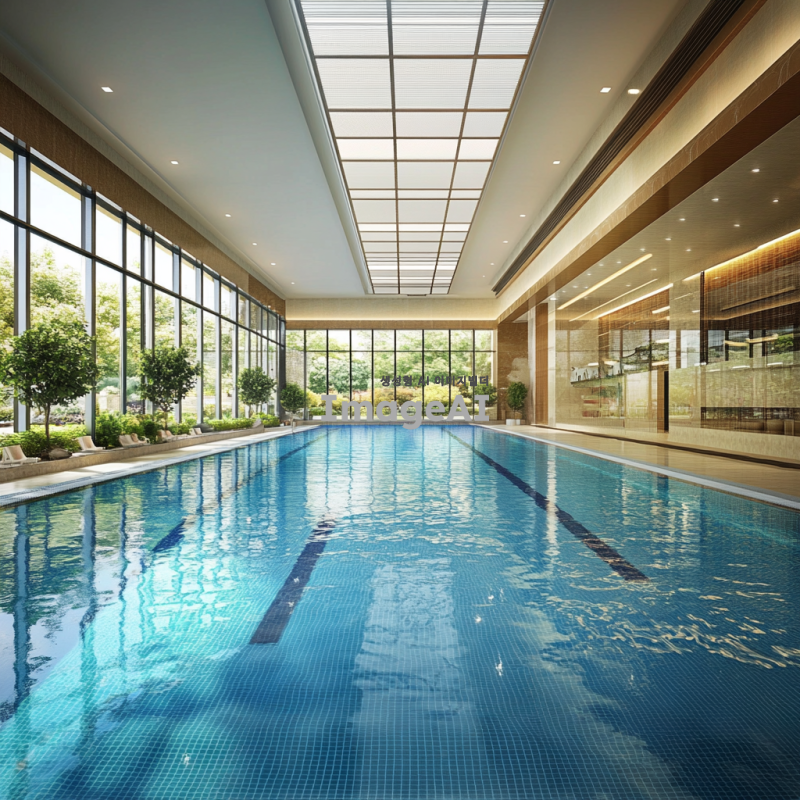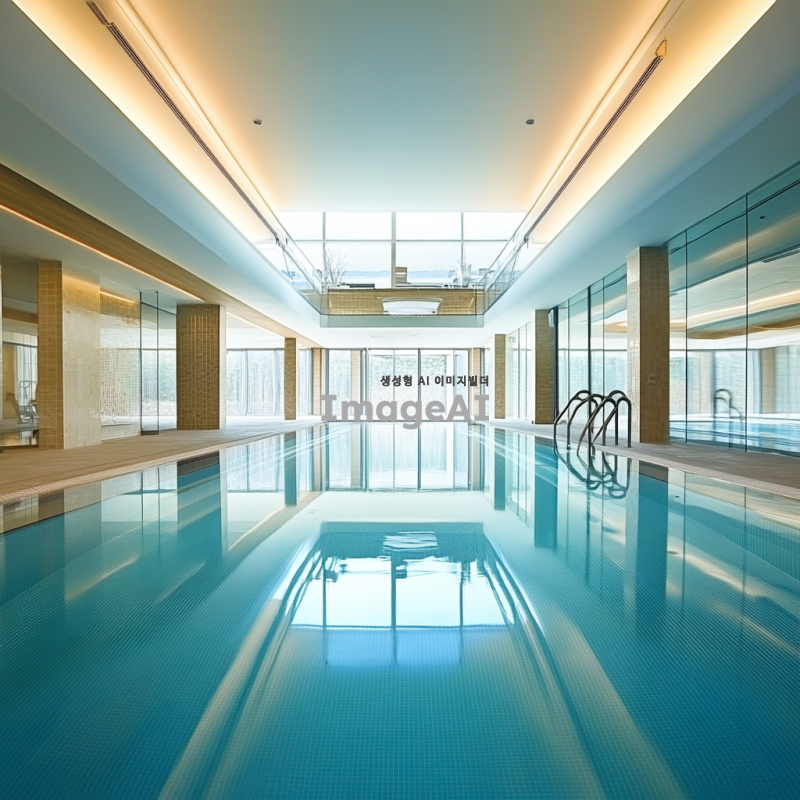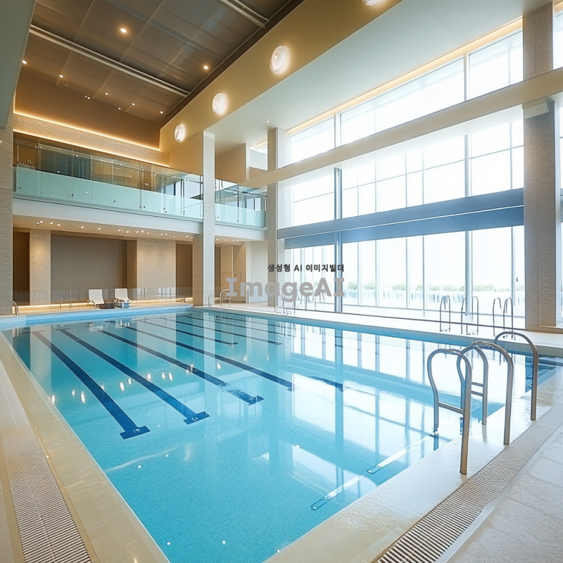 실내 수영 연습실, 현대적이고 깔끔한 디자인, 넓은 수영장과 푸른 물, 조명이 잘 배치된 쾌적한 환경, 벽면은 유리로 되어 있어 자연광이 잘 들어옴, 수영장 주변에는 안전을 위한 부드러운 난간과 미끄럼 방지 타일, 수영장 한쪽에는 초보자를 위한 얕은 구역, 전체적으로 조화로운 색상 배치와 세련된 인테리어.