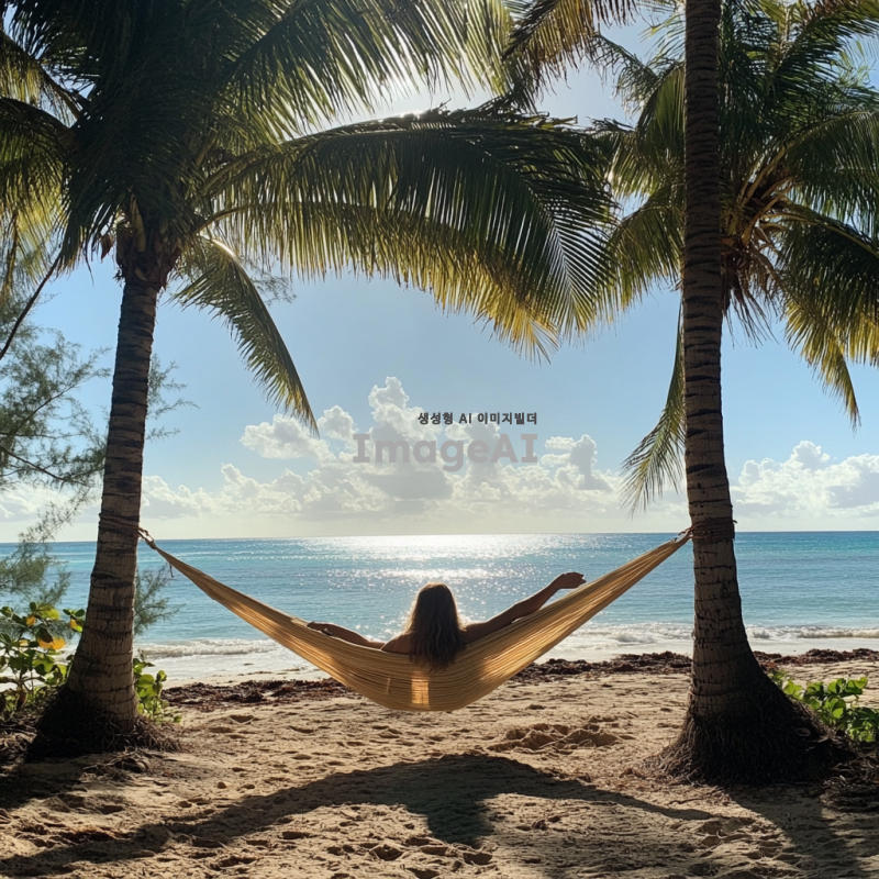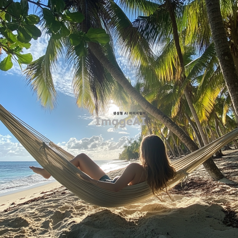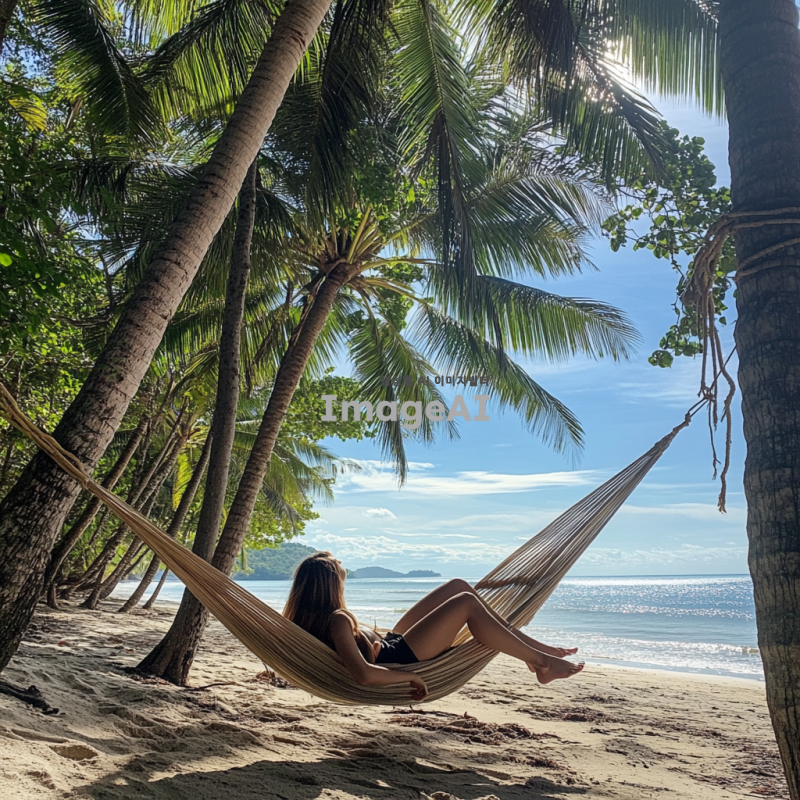 평화로운 해변에서 파도 소리를 들으며 휴식을 취하는 여성, 따뜻한 햇살 아래 해먹에 누워 있는 모습, 주변에는 야자수가 있고, 하늘은 맑고 푸른색, 부드러운 바람이 불어오는 장면, 자연의 아름다움이 강조된 편안한 분위기