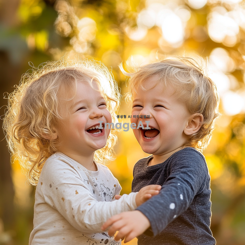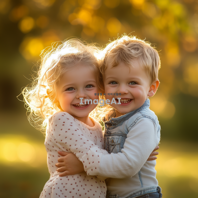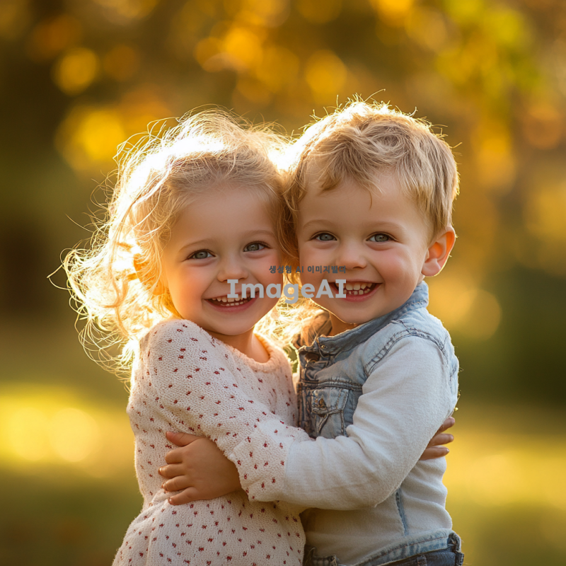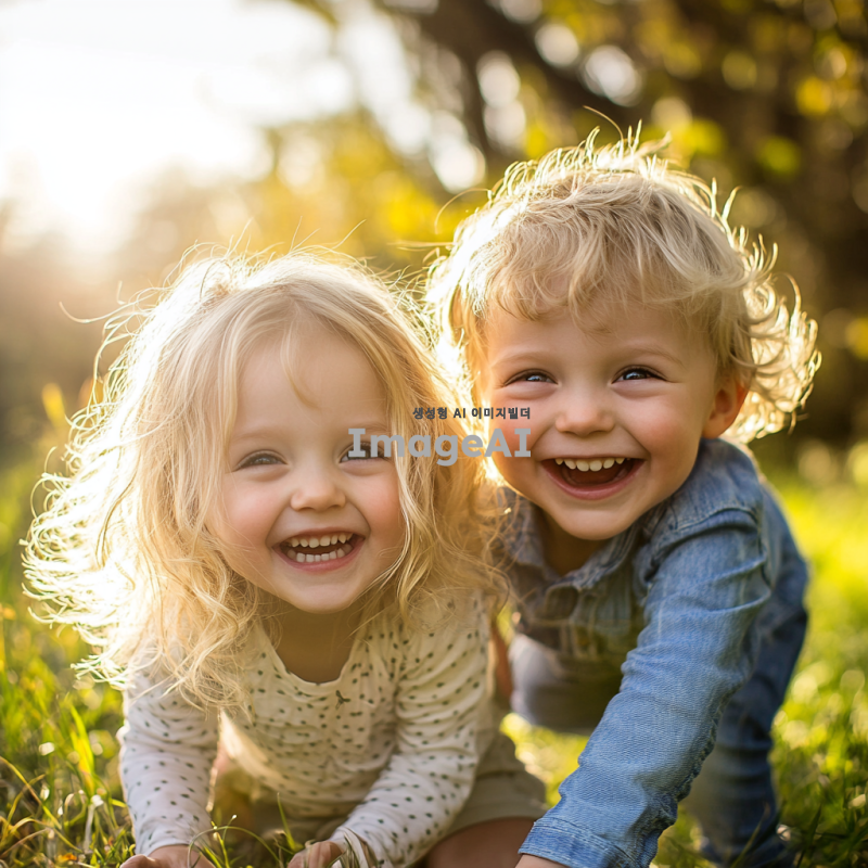 미국인 쌍둥이 아이들, 여자아이와 남자아이, 밝고 친근한 표정, 캐주얼한 옷차림, 자연스러운 배경, 따뜻한 햇살이 비치는 공원에서 놀고 있는 모습, 서로 웃으며 장난치는 장면, 금발 머리와 푸른 눈, 활기차고 즐거운 분위기.