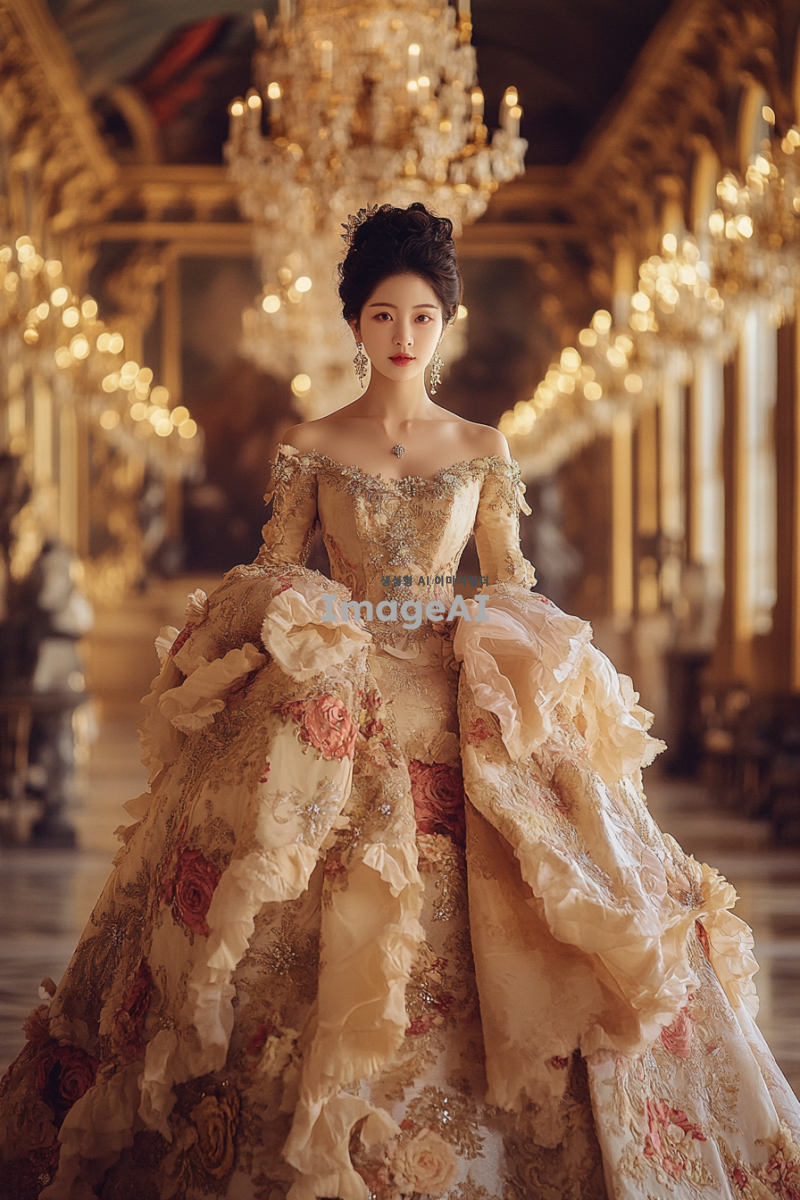 로코코 스타일의 화려한 드레스를 입은 한국인 여성, 드레스는 섬세한 레이스와 볼랑 장식이 가득하고, 부드러운 파스텔 톤의 색상으로 디자인됨. 배경은 18세기 유럽의 화려한 궁전 내부, 금빛 샹들리에와 고풍스러운 가구들이 조화를 이루며, 여성은 우아하게 미소 짓고 있음. 드레스의 디테일이 돋보이도록 조명은 부드럽고 따뜻한 느낌으로 설정.
