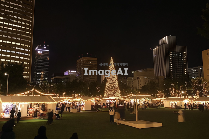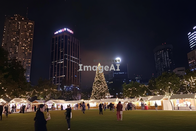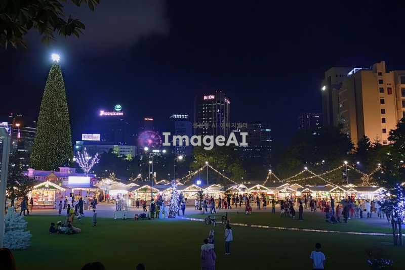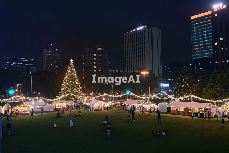 이 공원에 크리스마스 마켓행사가 진행중인것처럼 바꿔줘. 중앙엔 초대형 크리스마스 트리도 있고, 야외에는 알전구 조명들로 가득 장식되어 있고, 하얀색으로 된 크리스마스 마켓 길거리 노점들도 빼곡하게 가득차 있고, 축제를 즐기는 사람들로 발 디딜틈 없이 빼곡하게 가득차 있고, 화면에 보이는 고층 건물들은 없애줘.