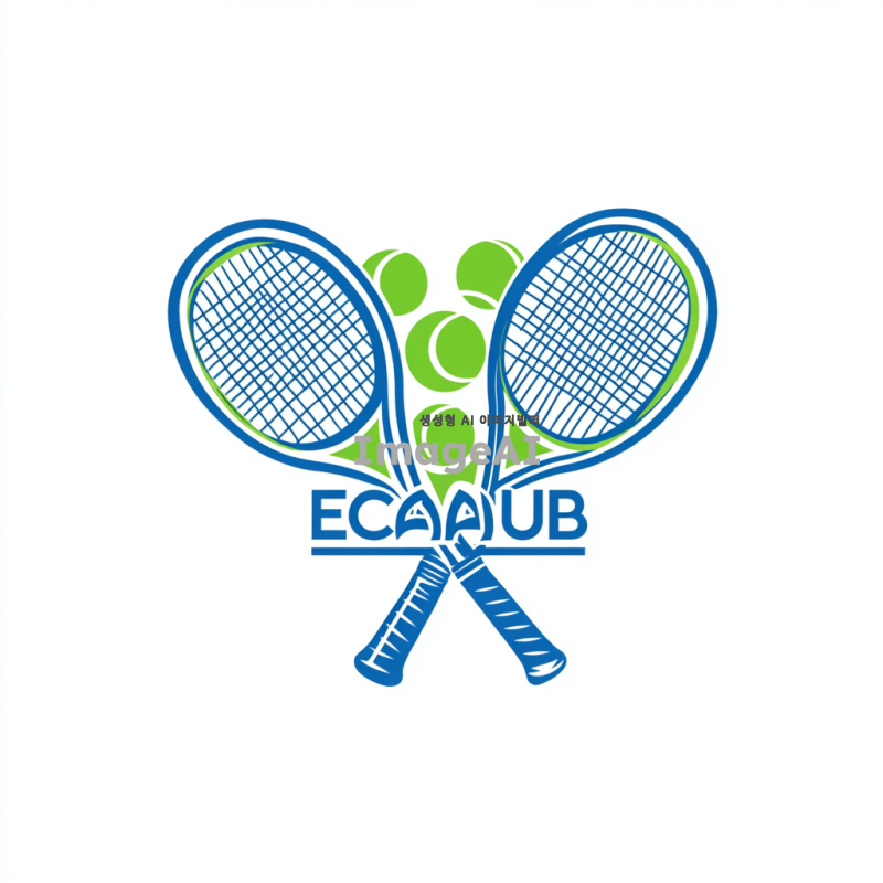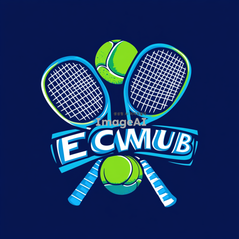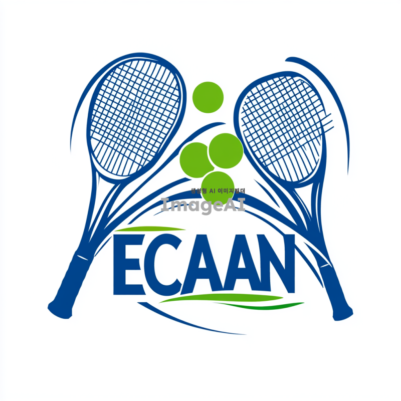 ECANA CLUB 테니스 로고 디자인, 테니스 라켓과 공을 포함한 현대적이고 세련된 스타일, 파란색과 녹색을 주된 색상으로 사용, 스포츠와 에너지를 상징하는 요소들, 클럽의 이름 'ECANA'를 중앙에 배치, 깔끔하고 읽기 쉬운 서체, 젊고 활기찬 느낌을 강조, 배경은 단순하게 유지하여 로고가 돋보이도록 구성.